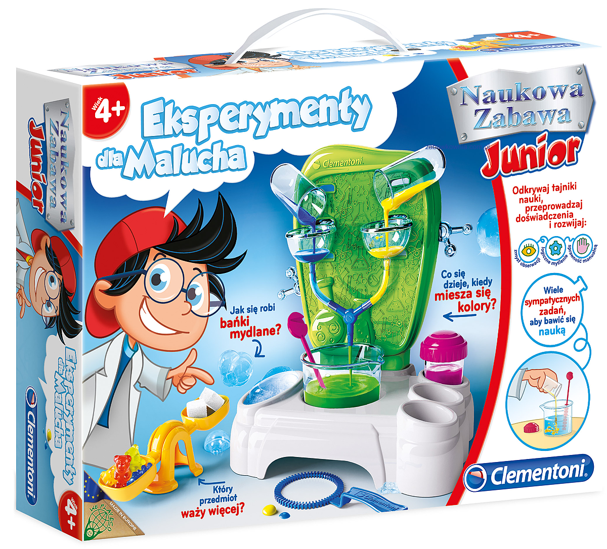 Odkrywaj tajniki nauki, przeprowadzaj doświadczenia i rozwijaj zmysł obserwacji, logiczne myślenie i sprawność manualną. Jeden z nielicznych zestawów naukowych, który do wejścia w zadziwiający świat zjawisk fizycznych i chemicznych zaprasza najmłodsze dzieci. Już czteroletnie dzieci mogą wkroczyć na naukową ścieżkę wykonując doświadczenia z tego zestawu!