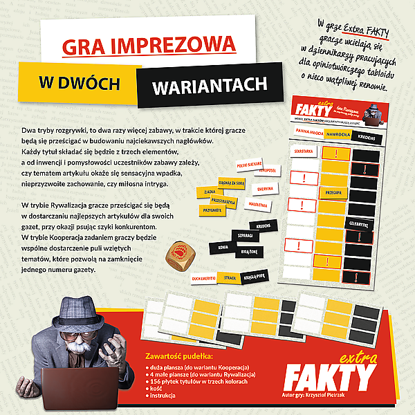 W grze Extra FAKTY gracze wcielają się w dziennikarzy pracujących dla opiniotwórczego tabloidu o nieco wątpliwej renomie. Dwa tryby rozgrywki, to dwa razy więcej zabawy, w trakcie której gracze będą się prześcigać w budowaniu najciekawszych nagłówków. Każdy tytuł składać się będzie z trzech elementów, a od inwencji i pomysłowości uczestników zabawy zależy, czy tematem artykułu okaże się sensacyjna wpadka, nieprzyzwoite zachowanie, czy miłosna intryga.