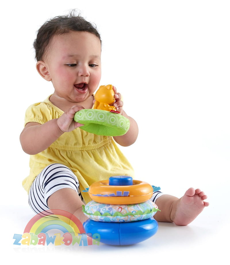 Układanie kółeczek na podstawie świetnie rozwija u dzieci koordynację ruchową, a szeleszczące, dzwoniące, kolorowe i wykonane z rozmaitych materiałów elementy stymulują zmysły wzroku, słuchu i dotyku dziecka.