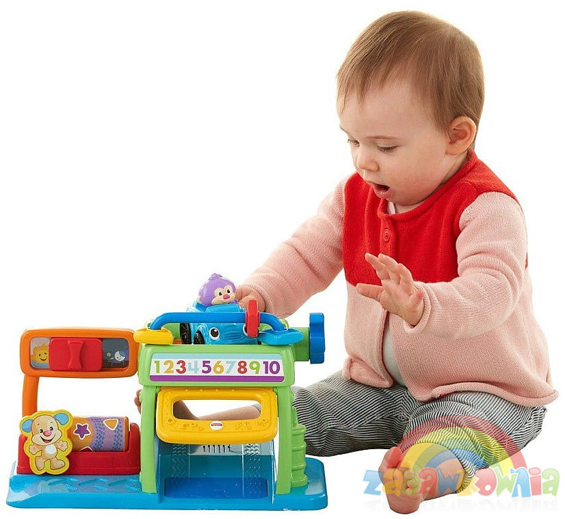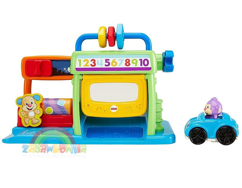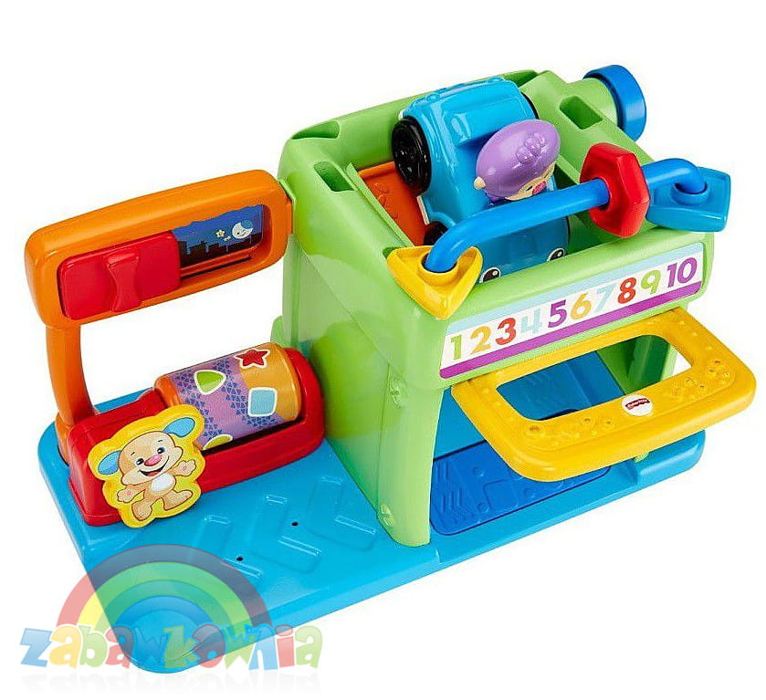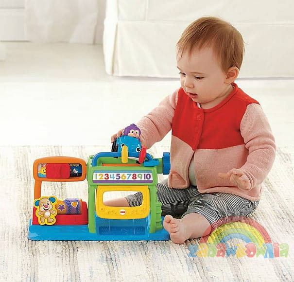 Szczeniaczek ma swój warsztacik samochodowy, w którym będzie majsterkować w samochodzie małpki. Dzieci będą mogły jednym pociągnięciem za klucz zrzucać autko z górnego poziomu przy dźwiękach i wesołych piosenkach. Autko z małpką spadnie i wyjedzie przez drzwi. Teraz jest już naprawione, zatankowane i gotowe do jazdy. Dzieci będą mogły włączać różne treści dźwiękowe, komunikaty edukacyjne i piosenki poprzez naciskanie szczeniaczka lub kręcenie wałeczkiem. Są też kolorowe koraliki oraz przesuwany znak dzień/noc. Warsztacik uczy pierwszych cyferek, kolorów, kształtów i literek. Komunikaty i piosenki są w języku polskim.
