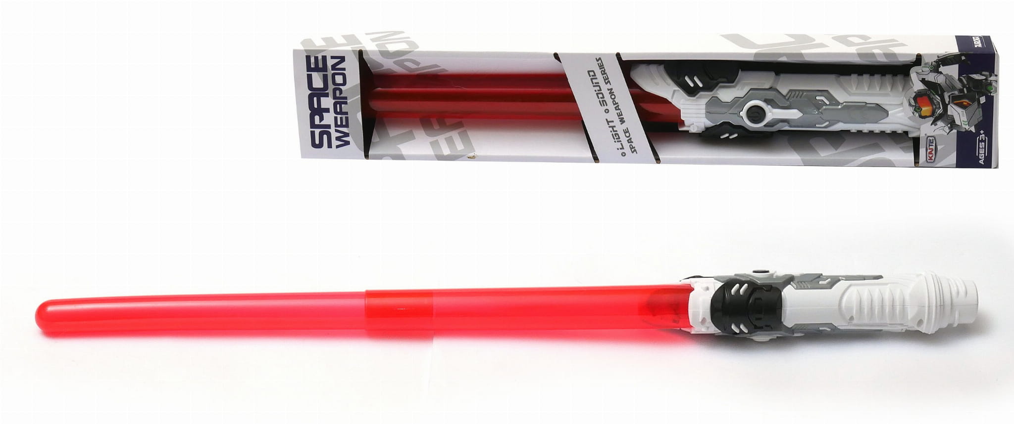 Miecz jest rozkładany aż do 80cm. Włączeniem przycisku zostaje aktywowany - włącza się dźwięk uruchamiania miecza, a światło w niego wbudowane zapala się na stałe.