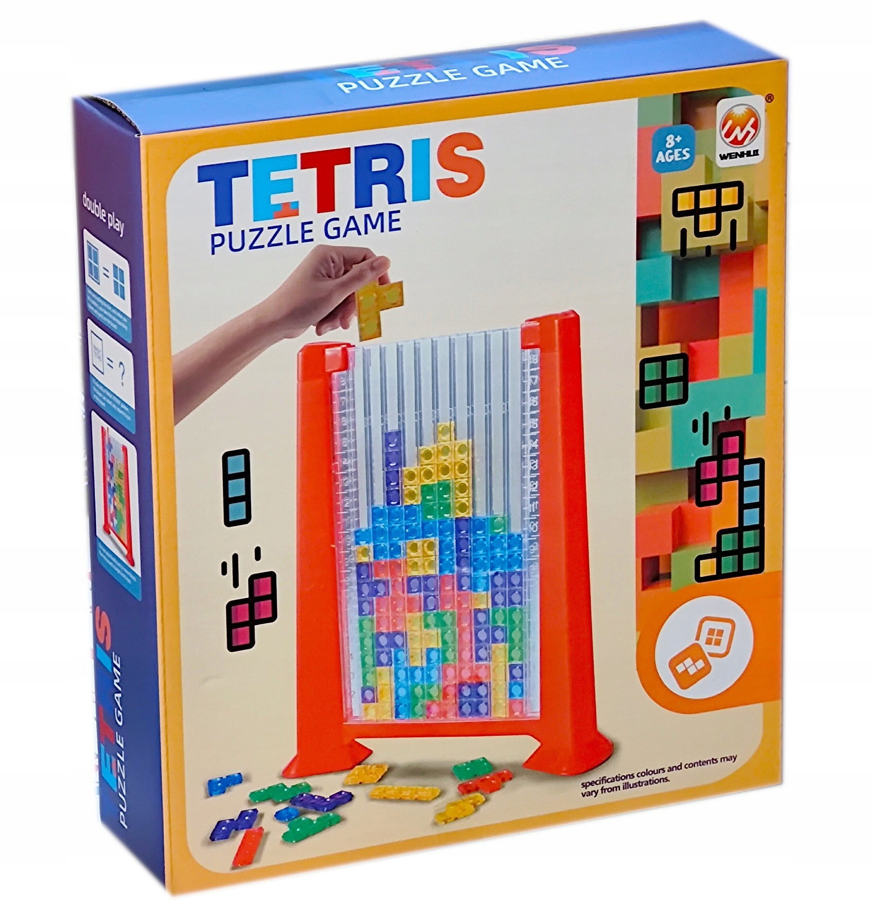 Zestaw zawiera aż 48 elementów, w tym planszę-podstawkę gry, 7 zestawów klocków o różnych kształtach i kolorach (żółty, zielony, czerwony, niebieski) oraz kostki, które dodaje element nieprzewidywalności do rozgrywki.