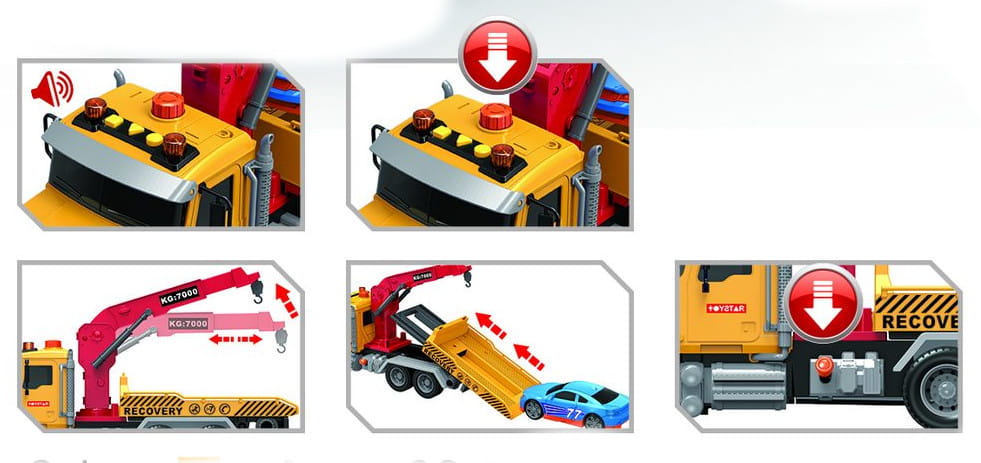 Ruchome elementy: Ten holownik posiada wiele ruchomych elementów, które dodają zabawie interaktywności i dynamiki. Można otwierać drzwi, podnosić i opuszczać platformę holowniczą, a także manewrować kółkami, aby dostosować się do różnych sytuacji.