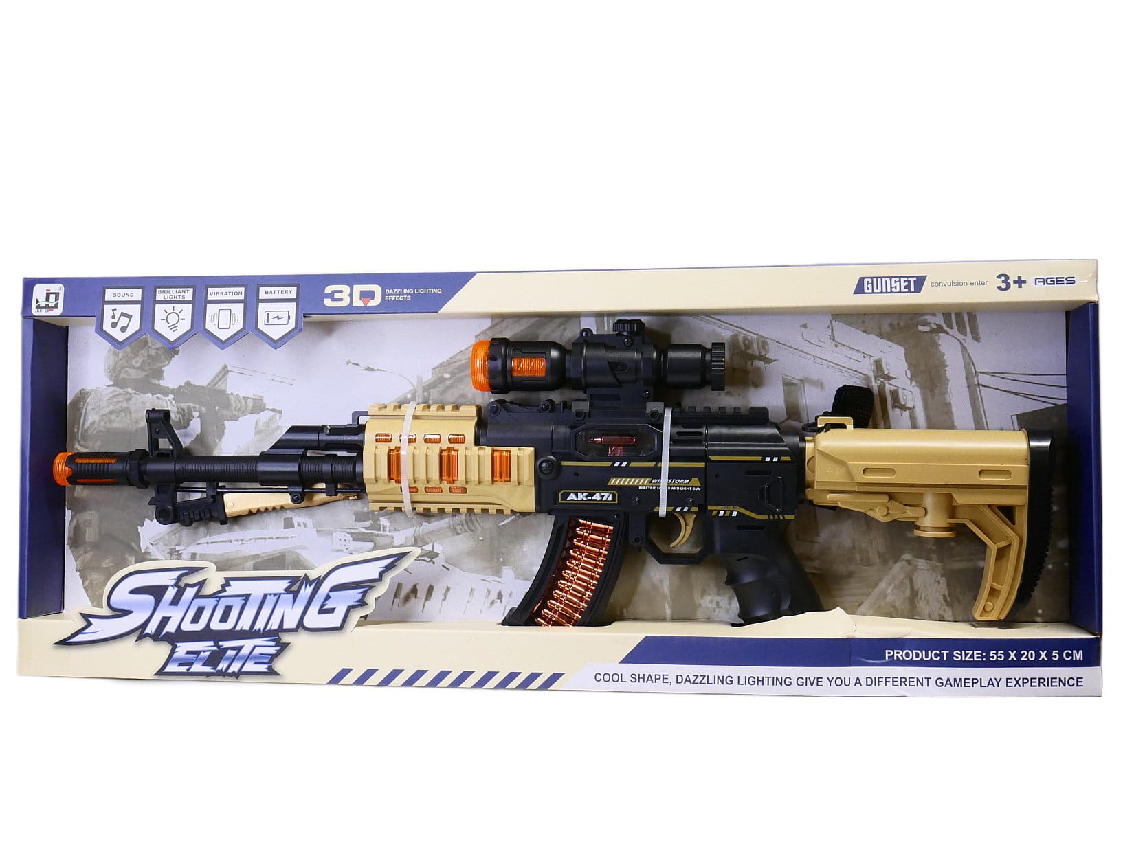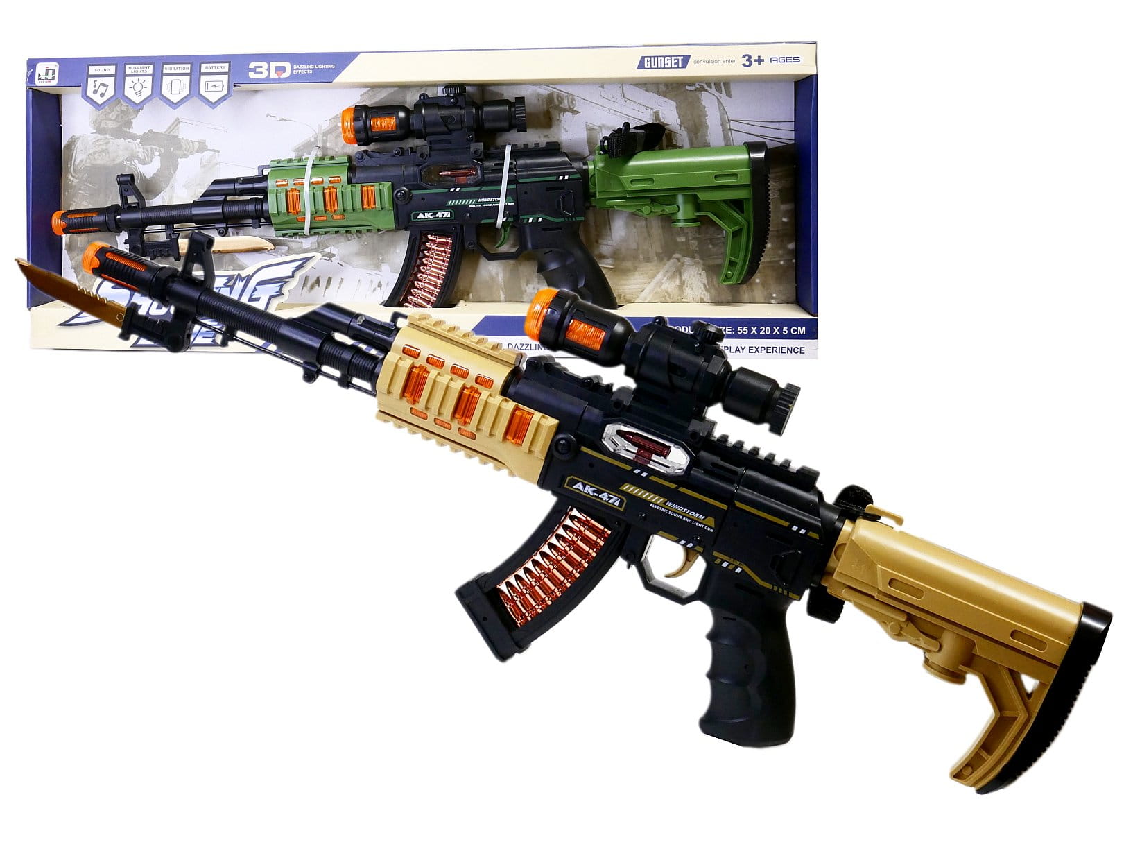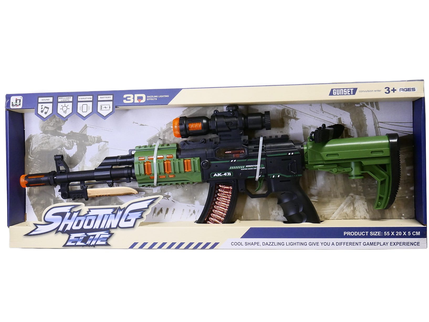 Kałasznikow to legendarny karabin, który w tej zabawkowej wersji. Gdy tylko naciśniemy spust karabinu usłyszymy dźwięki strzelania, a lufa i elementy z boku broni zostaną podświetlone kolorowymi światłami, a nasze dłonie poczują drżenie symulujące odrzut. AK47 ma przeźroczysty magazynek, w którym poruszają się naboje i dopinany pasek do przenoszenia na ramieniu. Duże gabaryty karabinu, efektowne podświetlane elementy sprawią, że zabawa w żołnierza stanie się bardzo realistyczna.