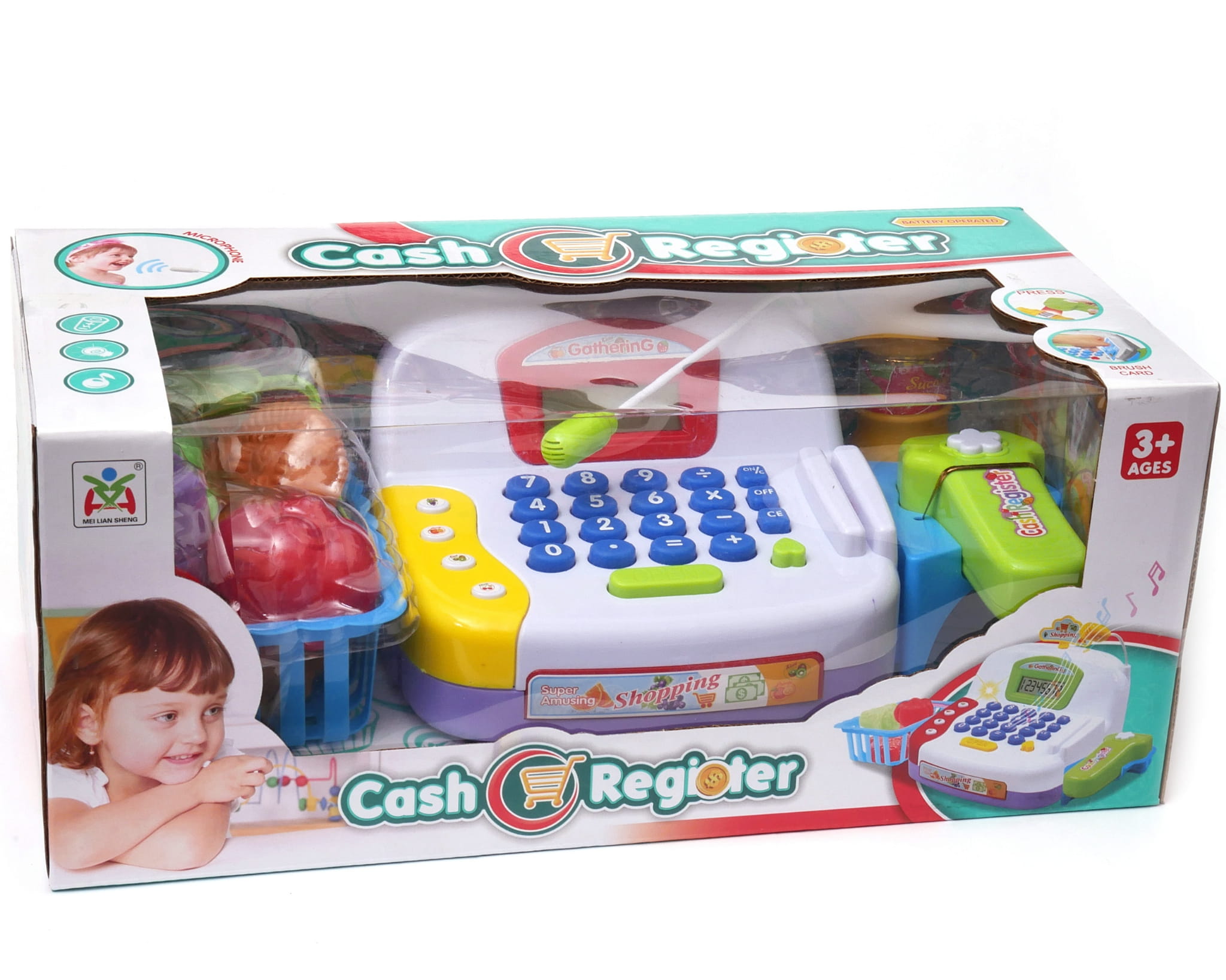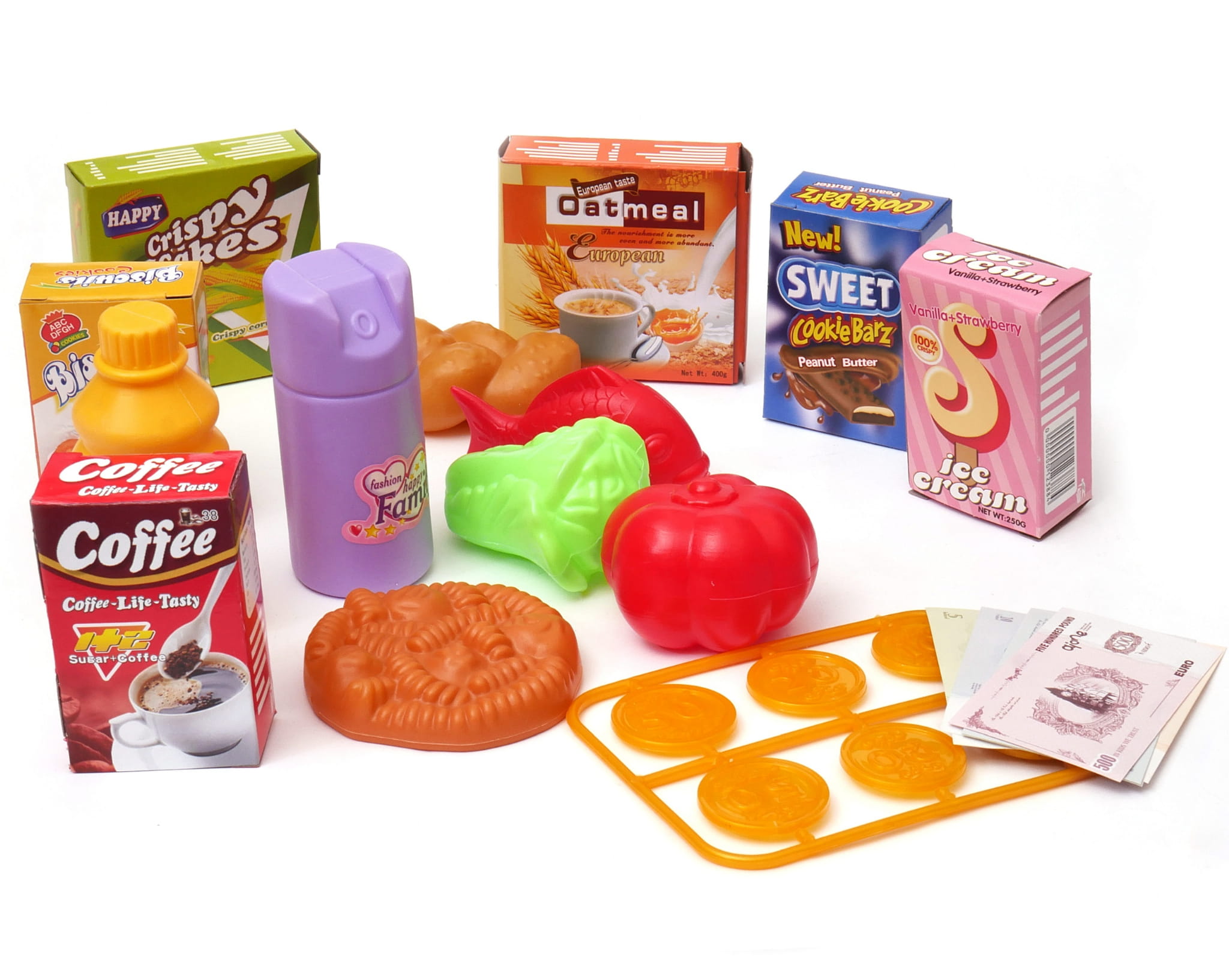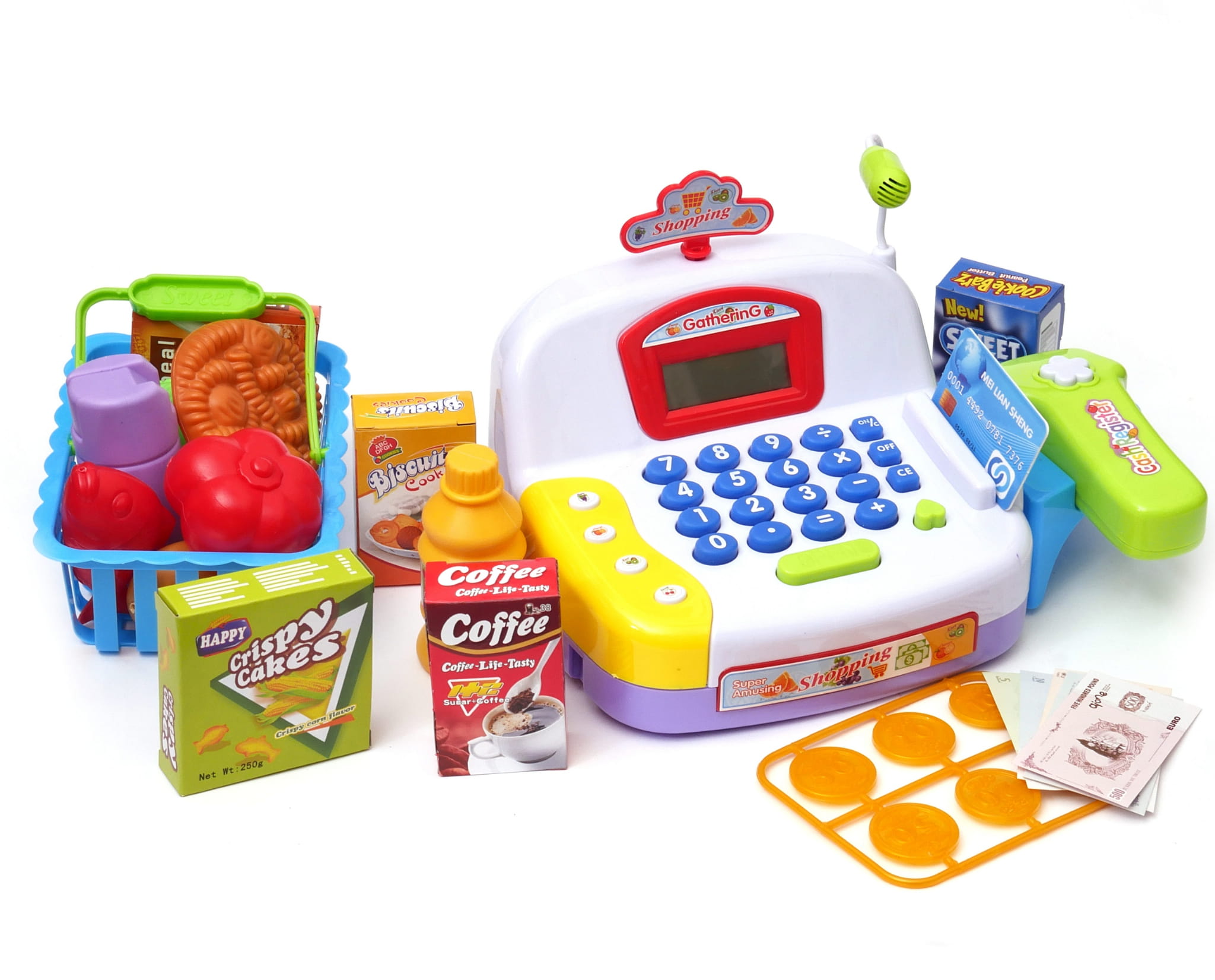 Zestaw sklepowy wraz z akcesoriami dla małych sprzedawców. Zabawka posiada wyświetlacz LCD, funkcjonalny kalkulator, szufladę na pieniądze z kluczykiem, czytnik kodów kreskowych i koszyk na zakupy. Wszystko wykonane z dobrej jakości plastiku i w ładnych kolorach.