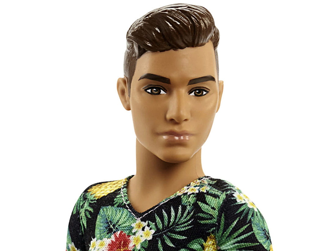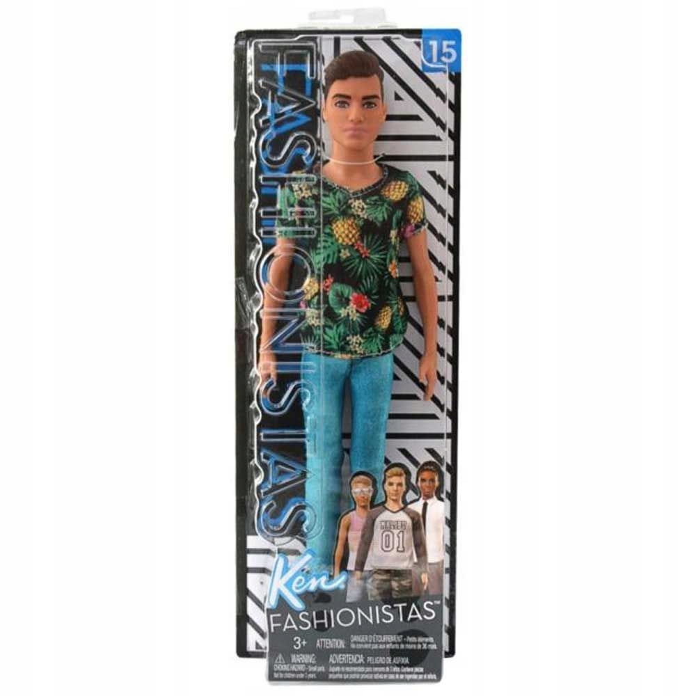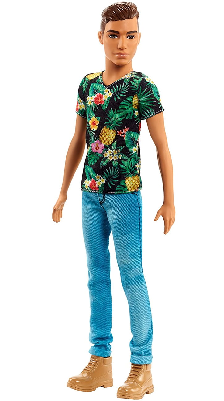 Nowy jak zwykle modny Ken Fashionistas w stylowej koszulce kwiecistej, spodniach jeansowych i butach w kolorze brązowym.