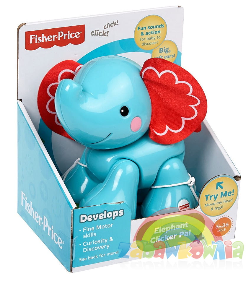 Zabawny słonik klikający to zabawka marki Fisher-Price skierowana do dzieci od 6-go miesiąca. Dzieci chętnie będą manipulować kończynami i głową słonia, a te podczas przekręcania będą klekotać. Taka zabawa klikającymi zwierzątkami rozwija zdolności manualne dzieci, ćwiczy rączki, a wydawane dźwięki intrygują i zachęcają do dalszej zabawy. W zabawce zastosowana różne faktury, w tym materiałowe uszy, aby ta stymulowała zmysł dotyku.