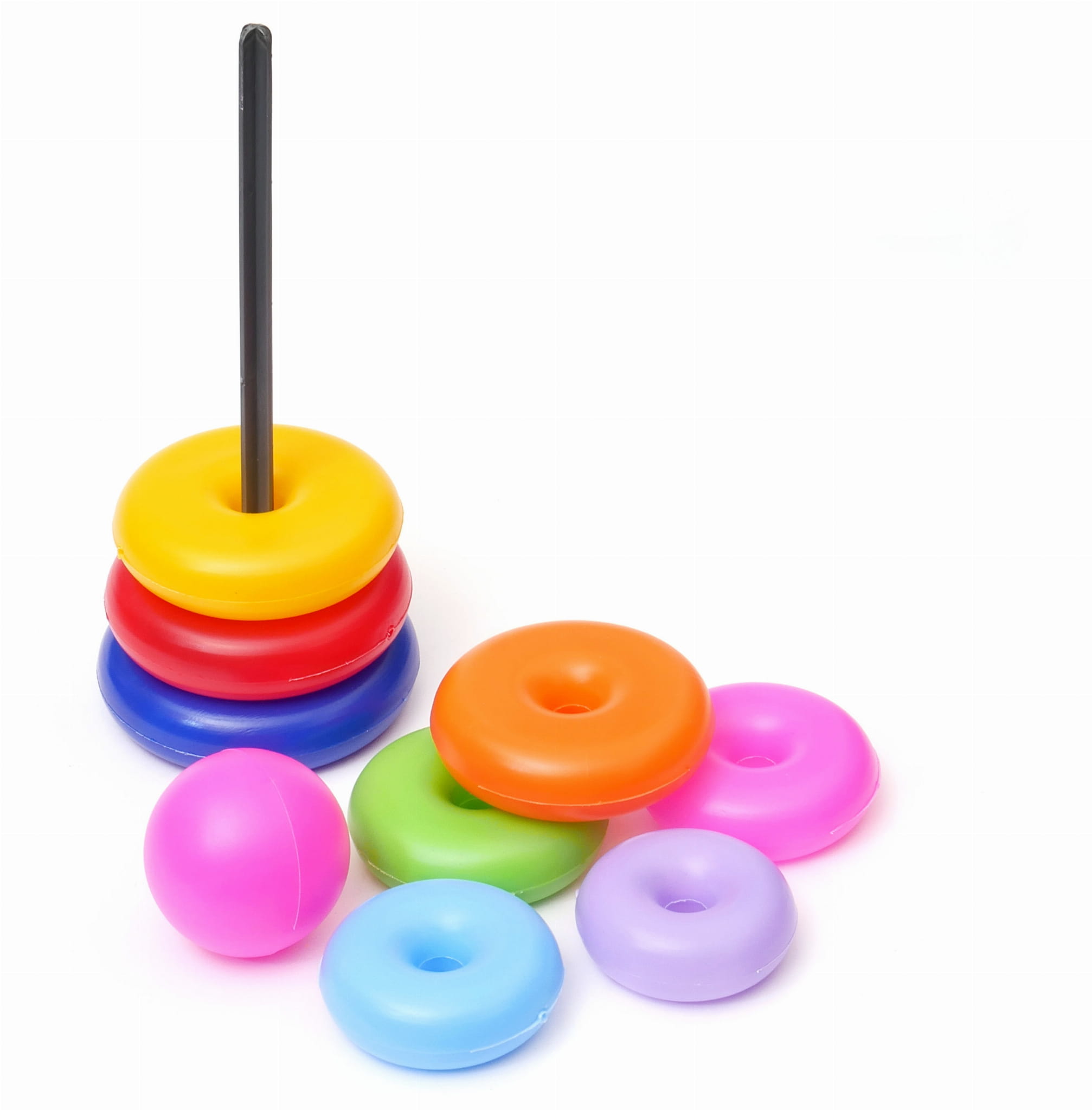 Jedna z najprostszych zabawek dla najmłodszych. Zestaw składa się z 8 kółek które można układać na podstawie z kijkiem. Kubeczki są w różnych kolorach i możemy je wykożystac do nauki nazw kolorów.