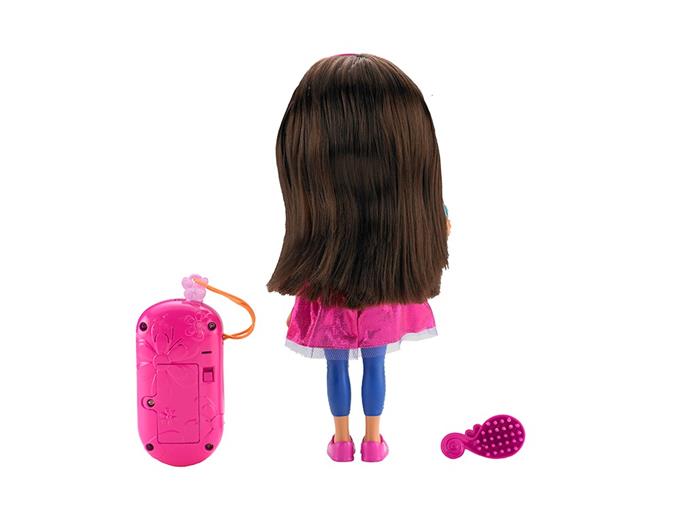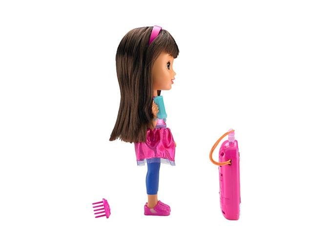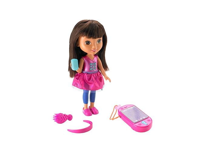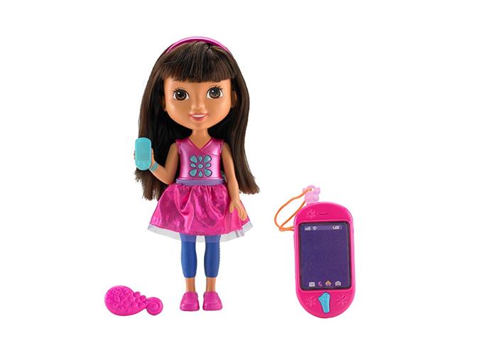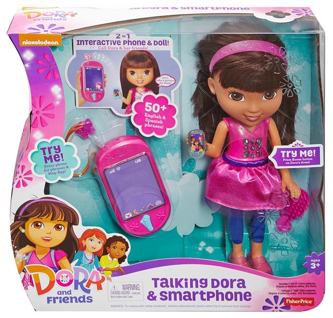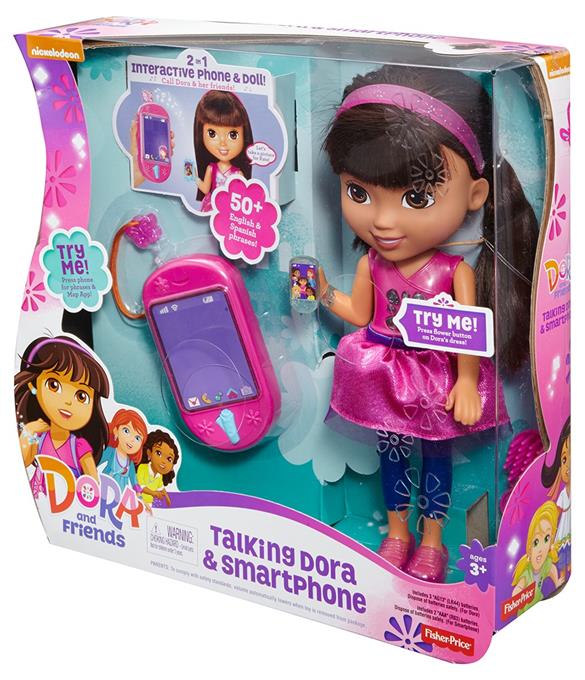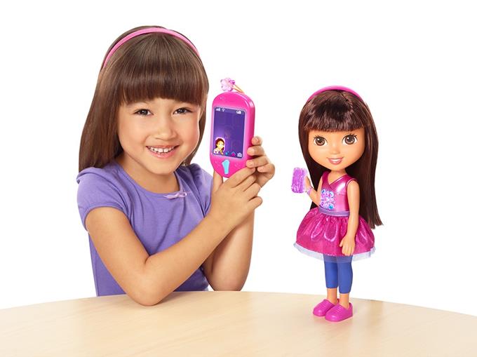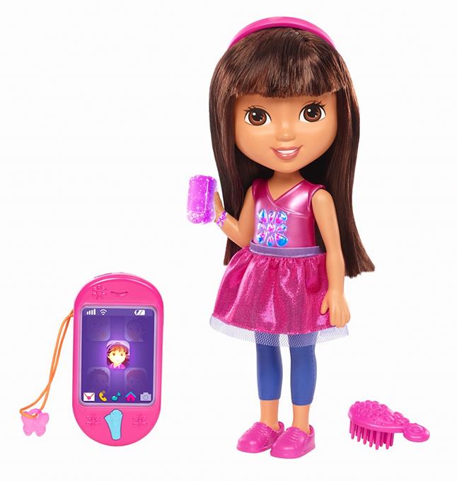 Lalka Dora potrafi mówić i posiada smartfonik tworząc duet do cudownej interaktywnej zabawy z kochaną bohaterką filmów dla dzieci. Dora ma świecącą bransoletkę i kwiatek, które świeca podczas śpiewania przez nią piosenek lub, gdy mówi. Ale to dopiero początek atrakcji, Dora ma swój smartfonik, a Ty otrzymasz swój, którym będziesz mogła do niej zadzwonić i naciskając przyciski w postaci Map-Apki na dole urządzenia lub motylka u góry. Zabawa rozpoczyna się po naciśnięciu kryształowego kwiatka Mówiącej Dory. Posłuchaj co ciekawego Dora ma do powiedzenia. Zadzwoń do niej i "porozmawiaj" o ulubionych scenach z filmów. Obserwuj kolorowe światełka!