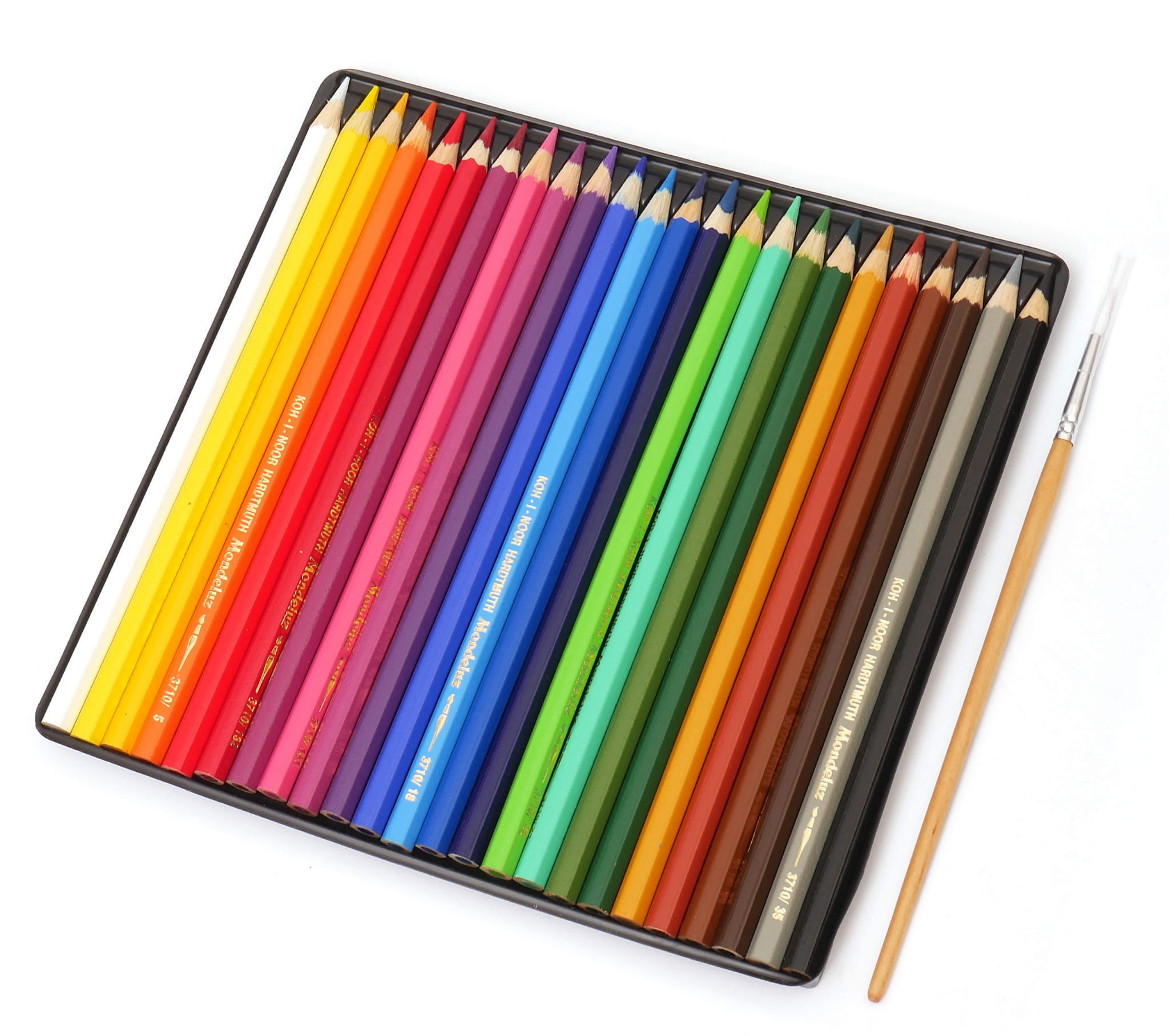 Kredki akwarelowe. Dzięki wysokiej jakości grafitu mogą być używane jak zwykłe kredki. Aby osiągnąć efekt akwareli należy zanurzyć kredkę w wodzie lub użyć wilgotnego pędzla.