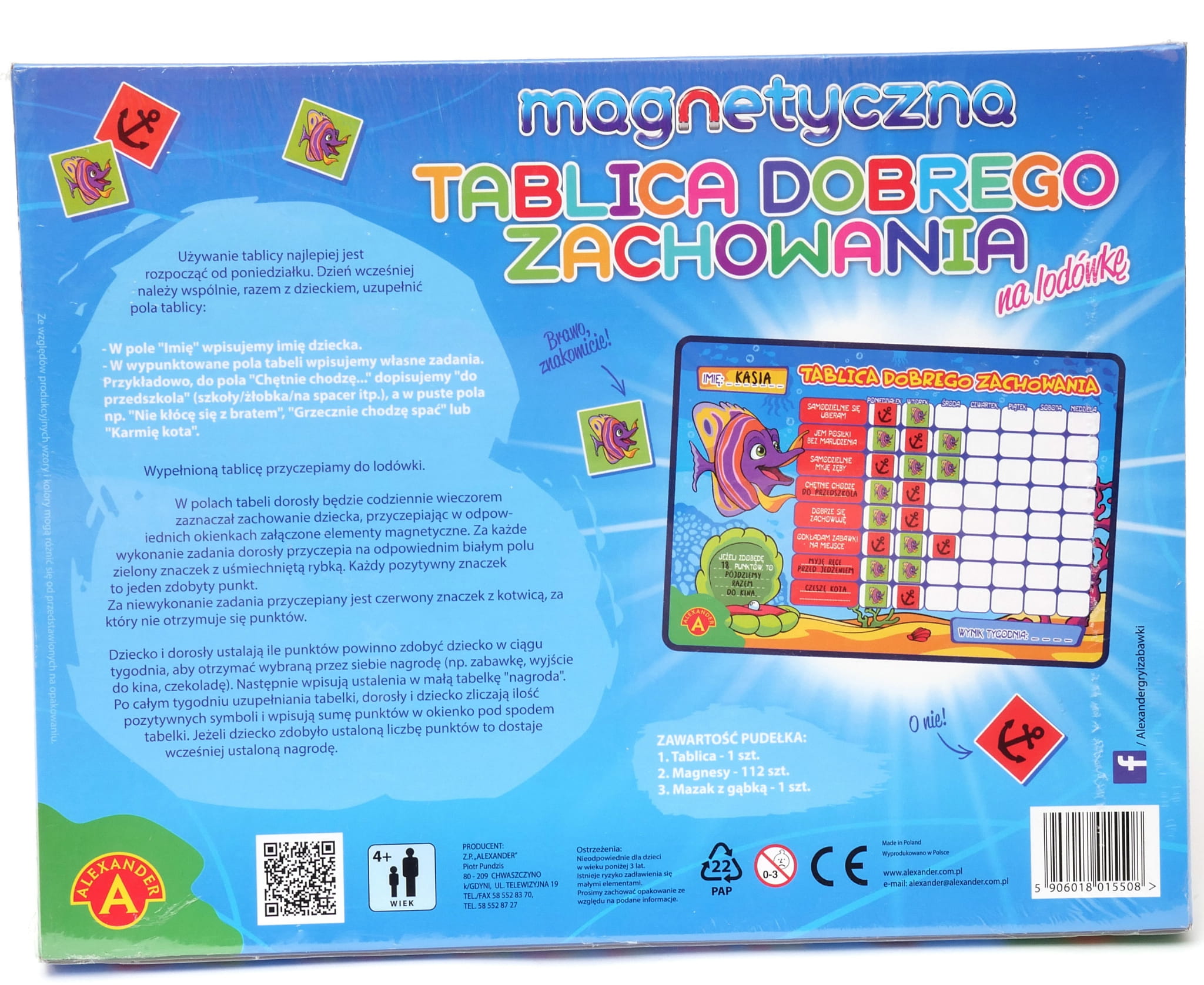 W polach tabeli dorosły będzie codziennie wieczorem zaznaczał zachowanie dziecka, przyczepiając w odpowiednich okienkach załączone elementy magnetyczne. Za każde wykonanie zadania dorosły przyczepia na odpowiednim białym polu zielony znaczek z uśmiechniętą rybką. Za niewykonanie zadania przyczepiany jest czerwony znaczek z kotwicą, za który nie otrzymuje się punktów.