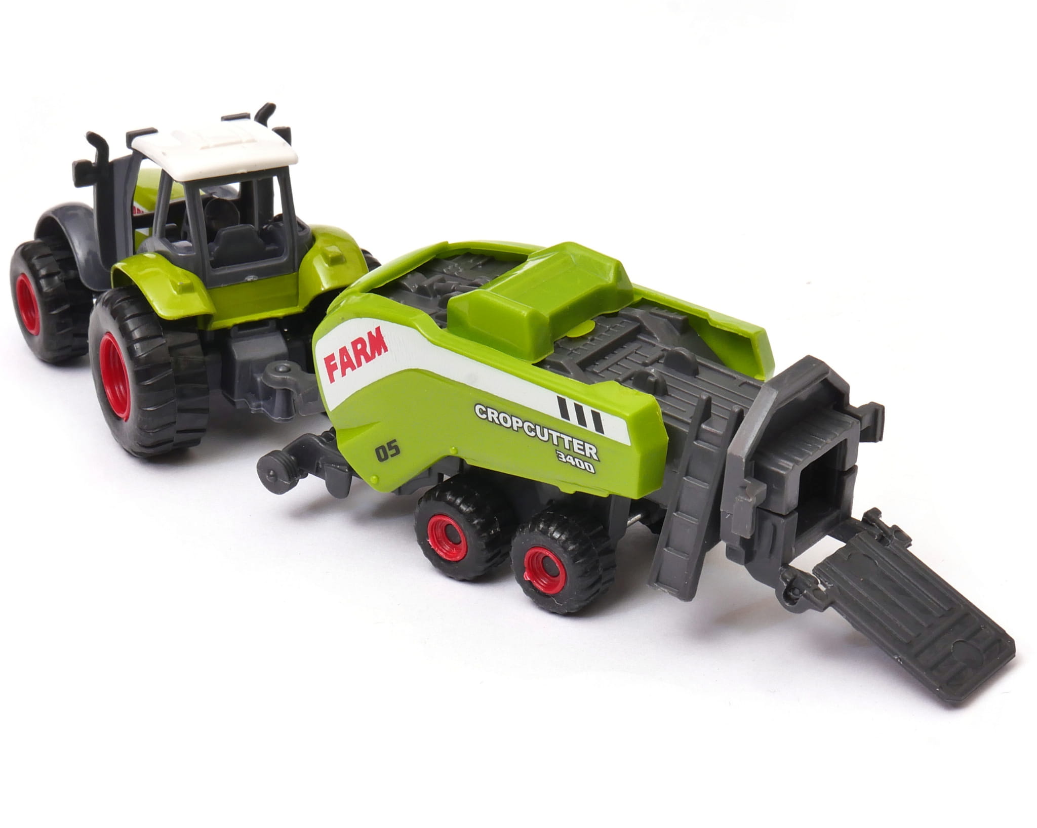 Ogromny traktor rolniczy z zestawem prasowania słomy. Chłopcy uwielbiają przyglądać się pracy potężnej maszyny, a ta zabawka sprawi, że poczują się wyjątkowymi posiadaczami jednej z nich. Przyczepa odczepiana jest od ciągnika i możliwa jest zabawa zarówno zestawem jak i samym traktorem.