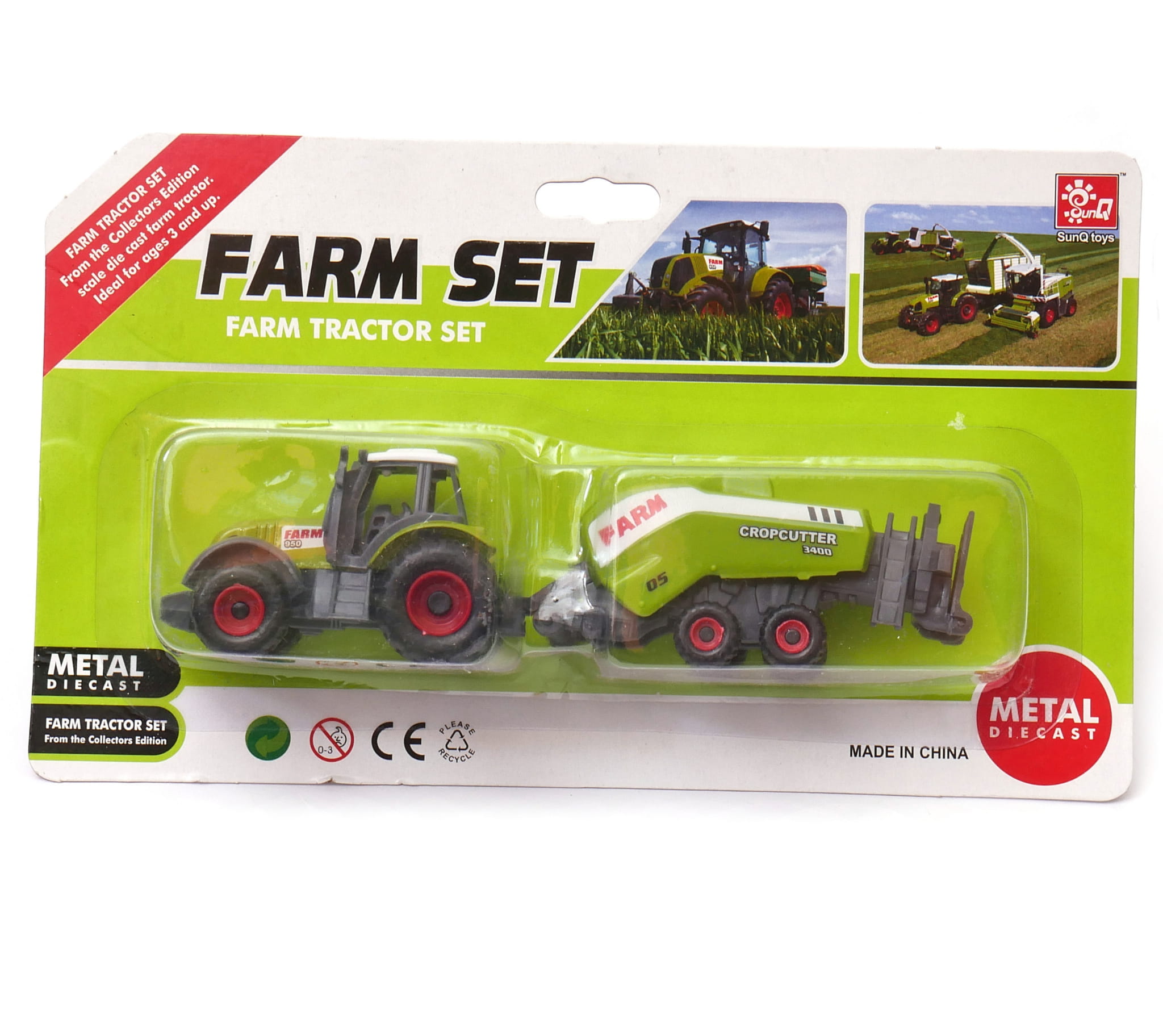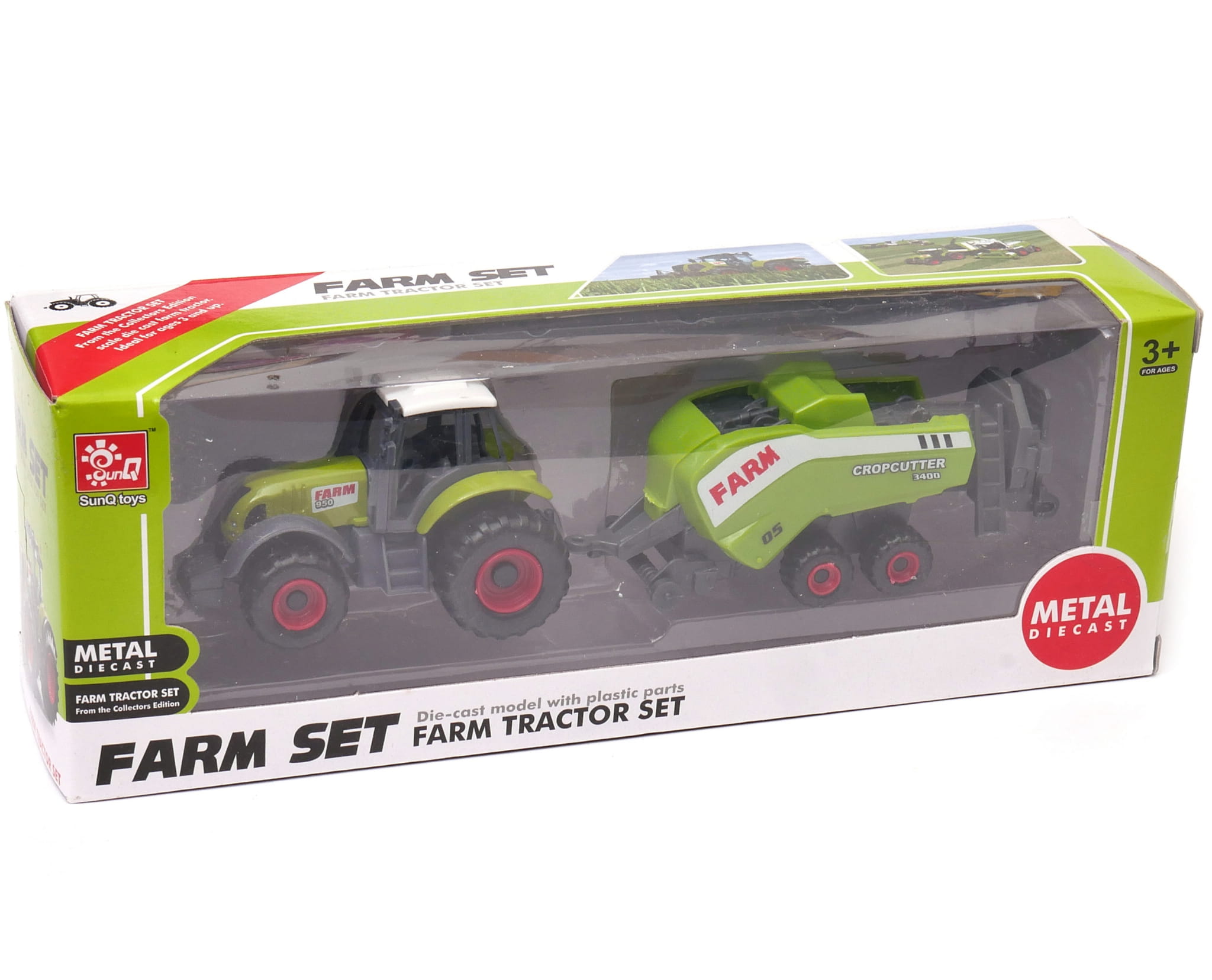 Zestaw składa się z ciągnika rolniczego i przyczep: wału uprawnego i prasozwijarki. Dzieci kochają traktory, a taka kolekcja nadaje się na prezent, który pozwoli na zabawę w rolniczą farmę.