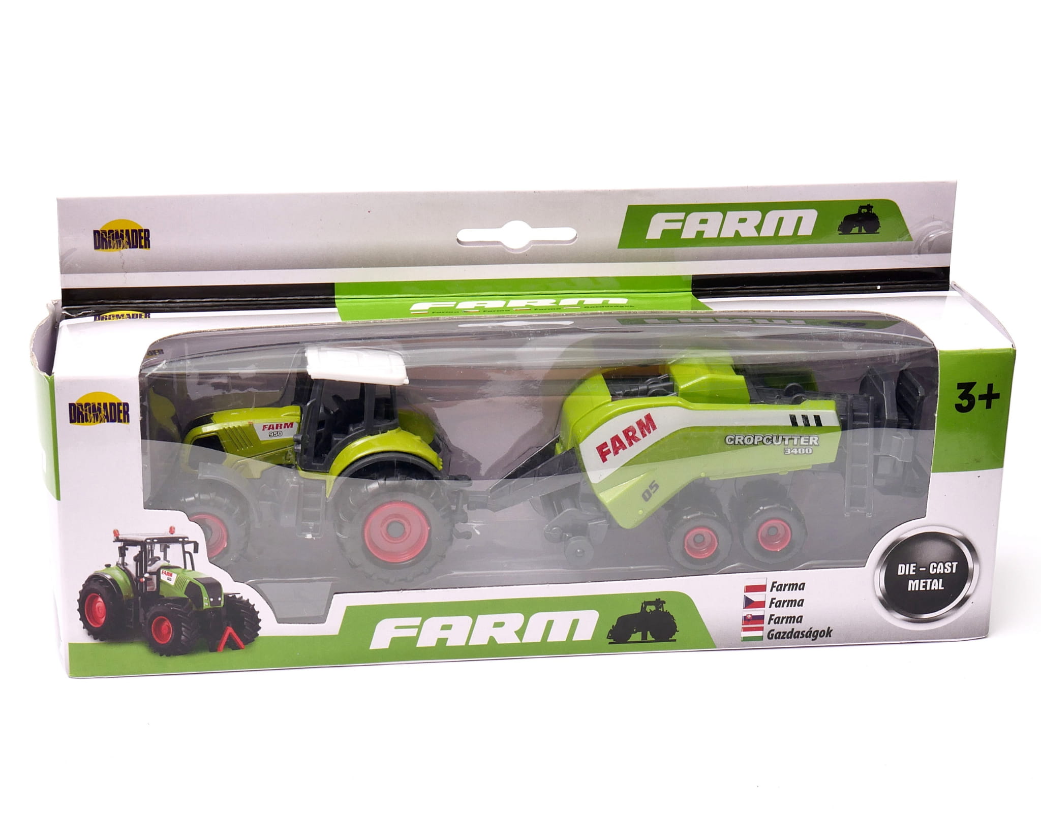 Zestaw składa się z ciągnika rolniczego i przyczep: wału uprawnego i prasozwijarki. Dzieci kochają traktory, a taka kolekcja nadaje się na prezent, który pozwoli na zabawę w rolniczą farmę.