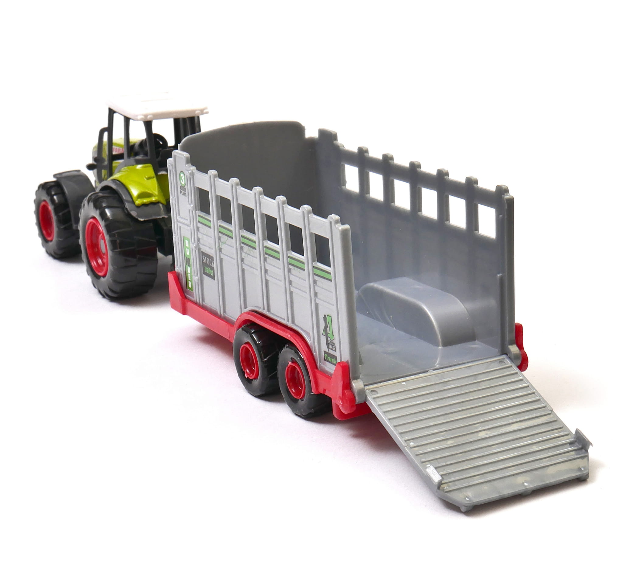 Duży traktor rolniczy z przyczepą ma podnoszoną maskę, a na dachu trzy przyciski włączające reflektory i różne odgłosy. Tylne koła wyposażone są w napęd zamachowy. Zabawkowy ciągnik rolniczy jest dość dokładnie odwzorowany dając dużo satysfakcji z zabawy i będzie pięknie się prezentował na półce z zabawkami.