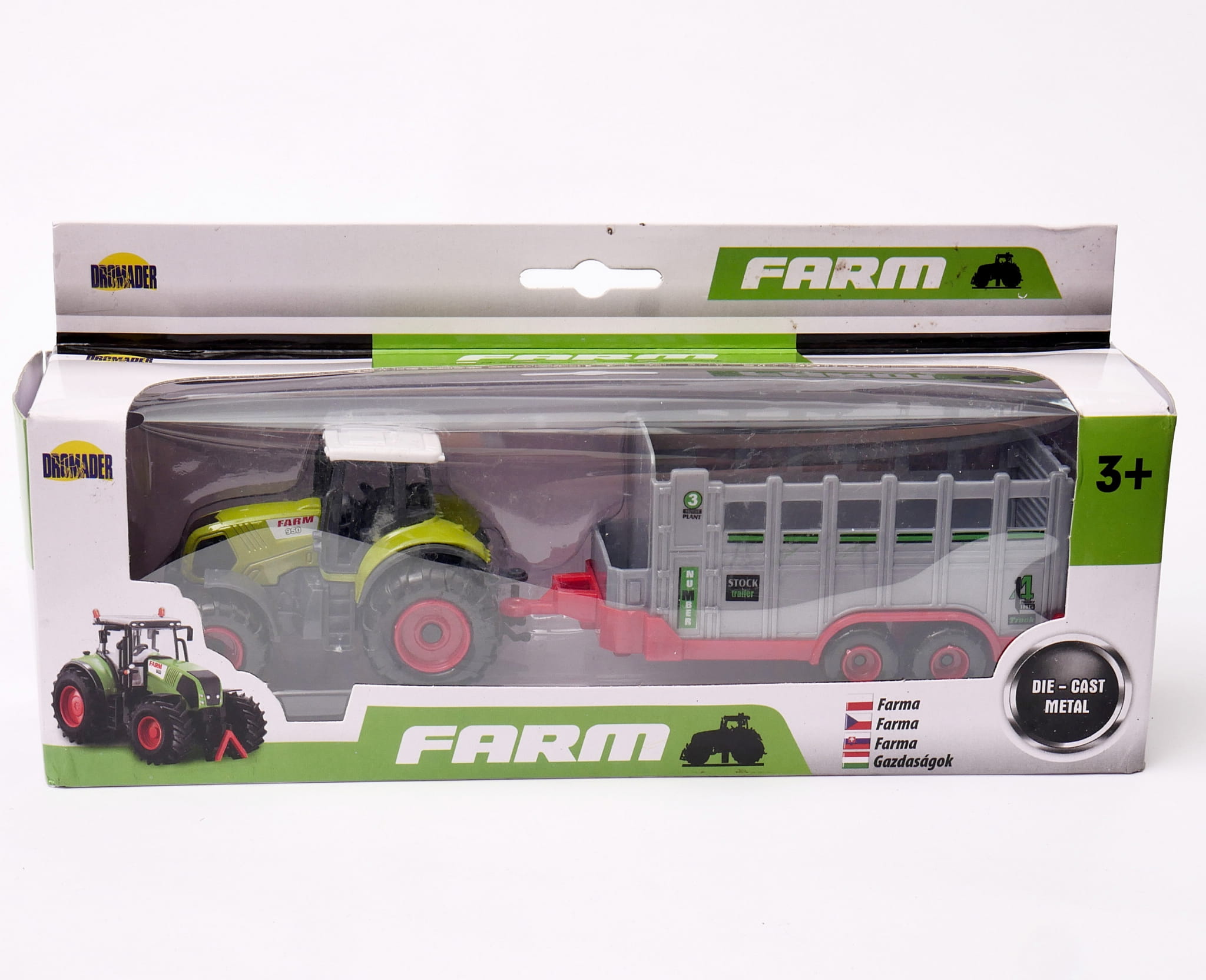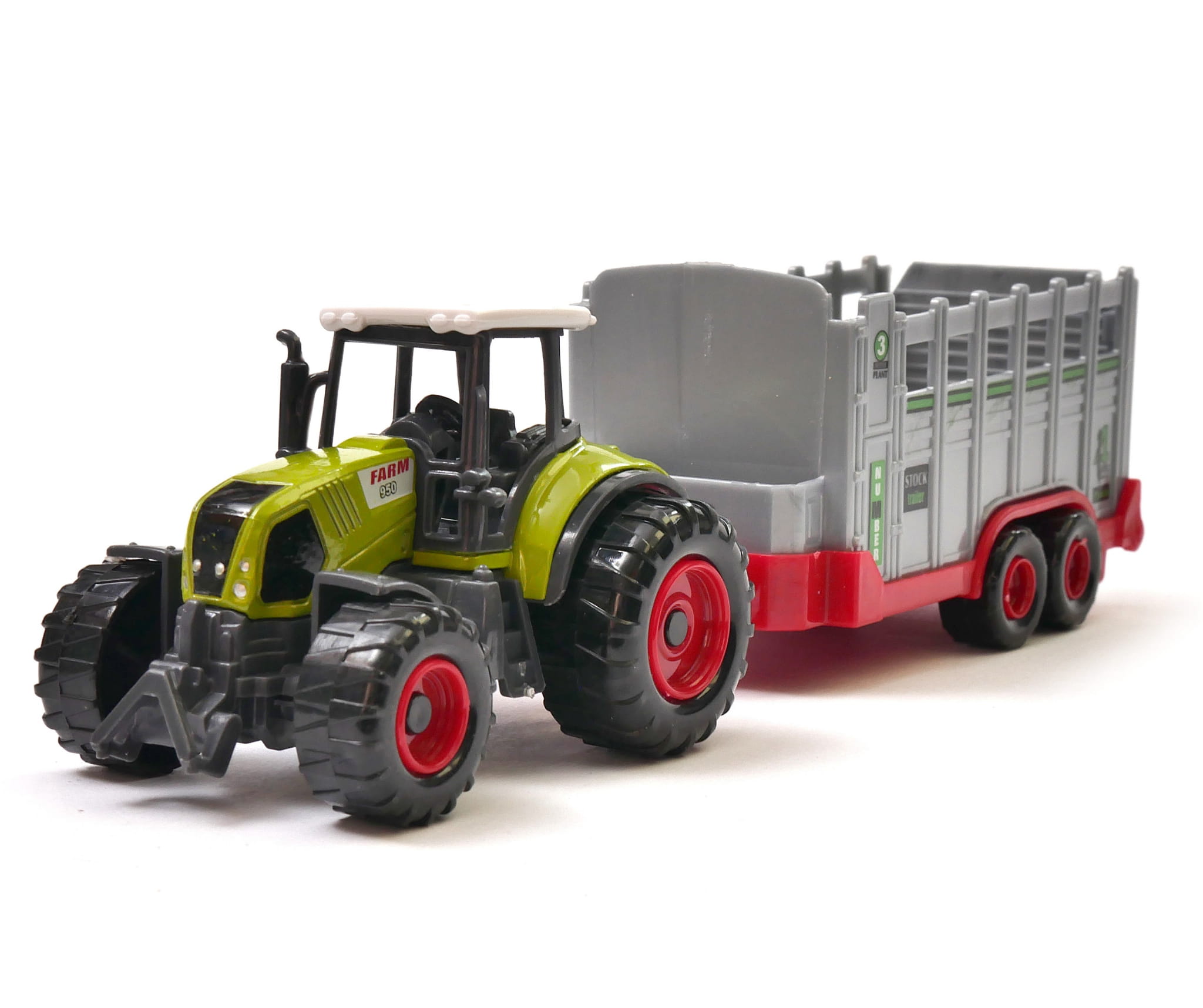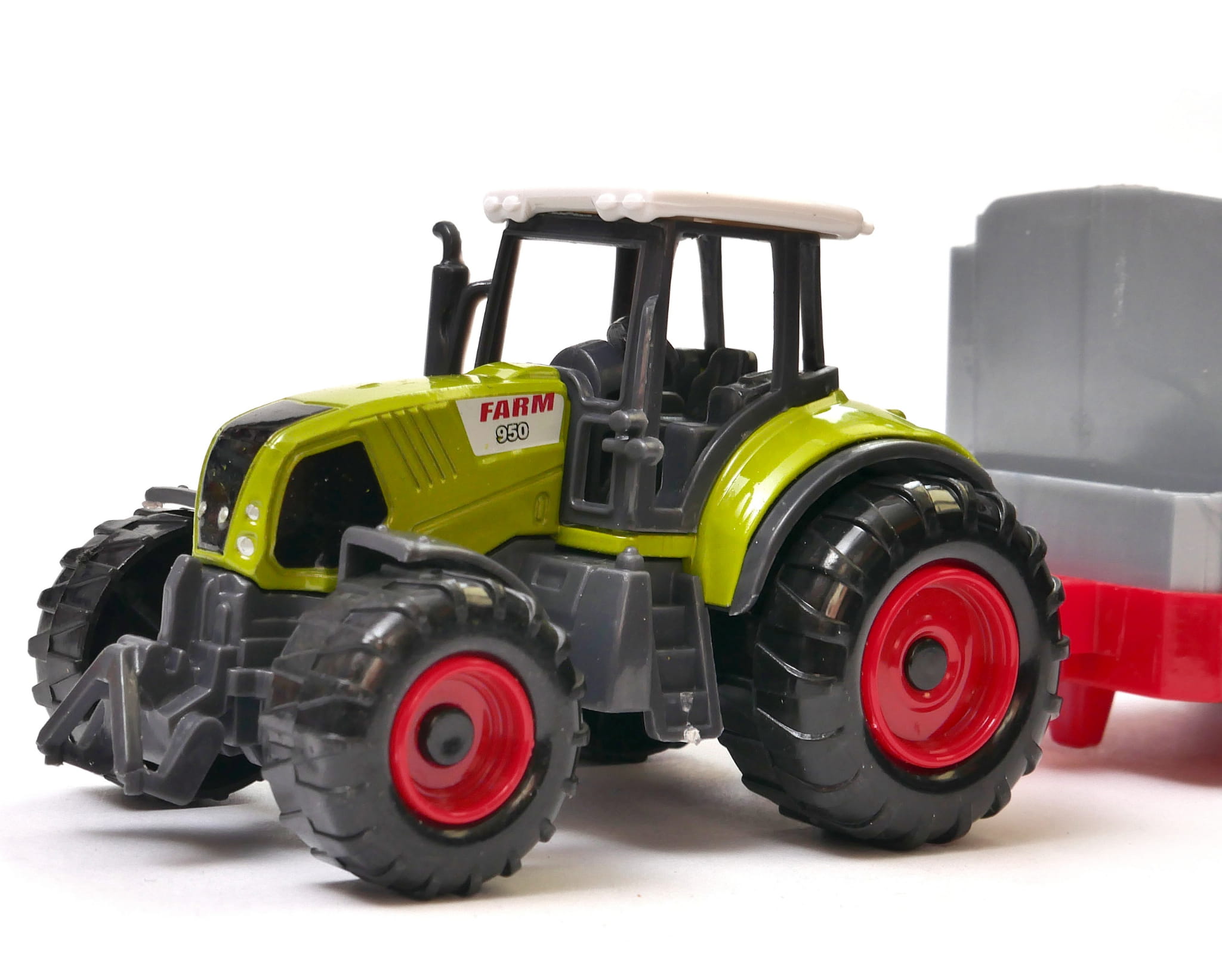 Duży traktor rolniczy z przyczepą wywrotką. Chłopcy uwielbiają przyglądać się pracy potężnej maszyny, a ta zabawka sprawi, że poczują się wyjątkowymi posiadaczami jednej z nich. Przyczepa odczepiana jest od ciągnika i możliwa jest zabawa zarówno zestawem jak i samym traktorem.