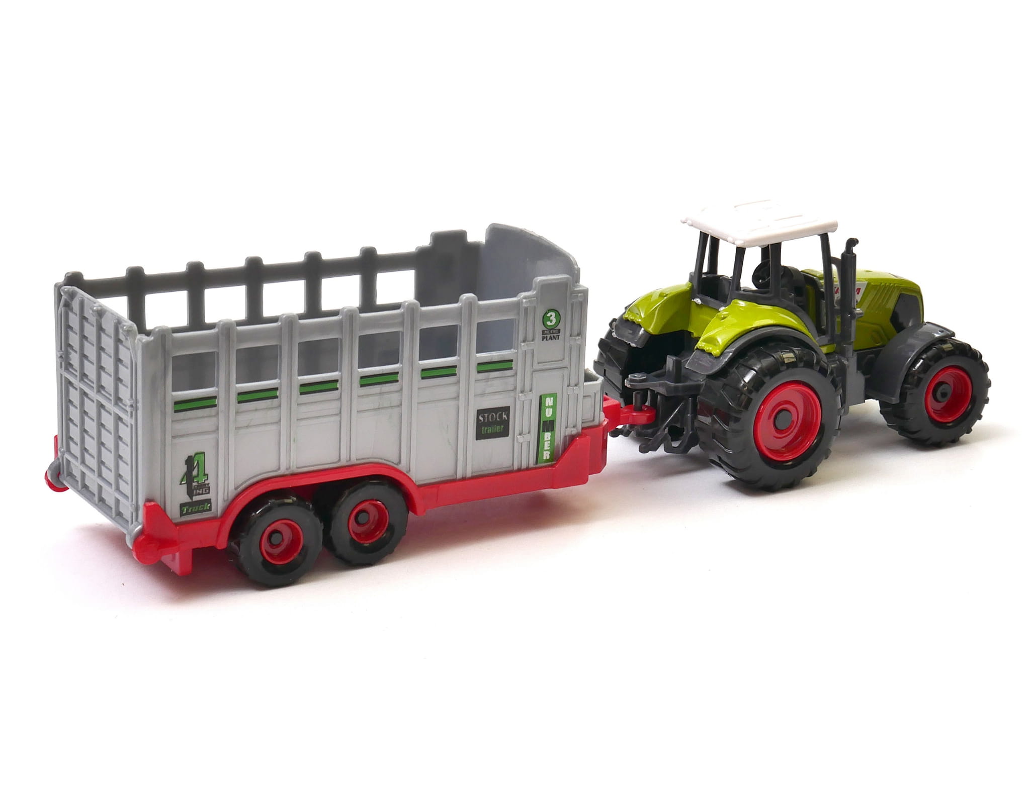 Zestaw składa się z ciągnika rolniczego i przyczepy wywrotki z uchylną skrzynią. Dzieci kochają traktory, a taka kolekcja nadaje się na prezent, który pozwoli na zabawę w rolniczą farmę.