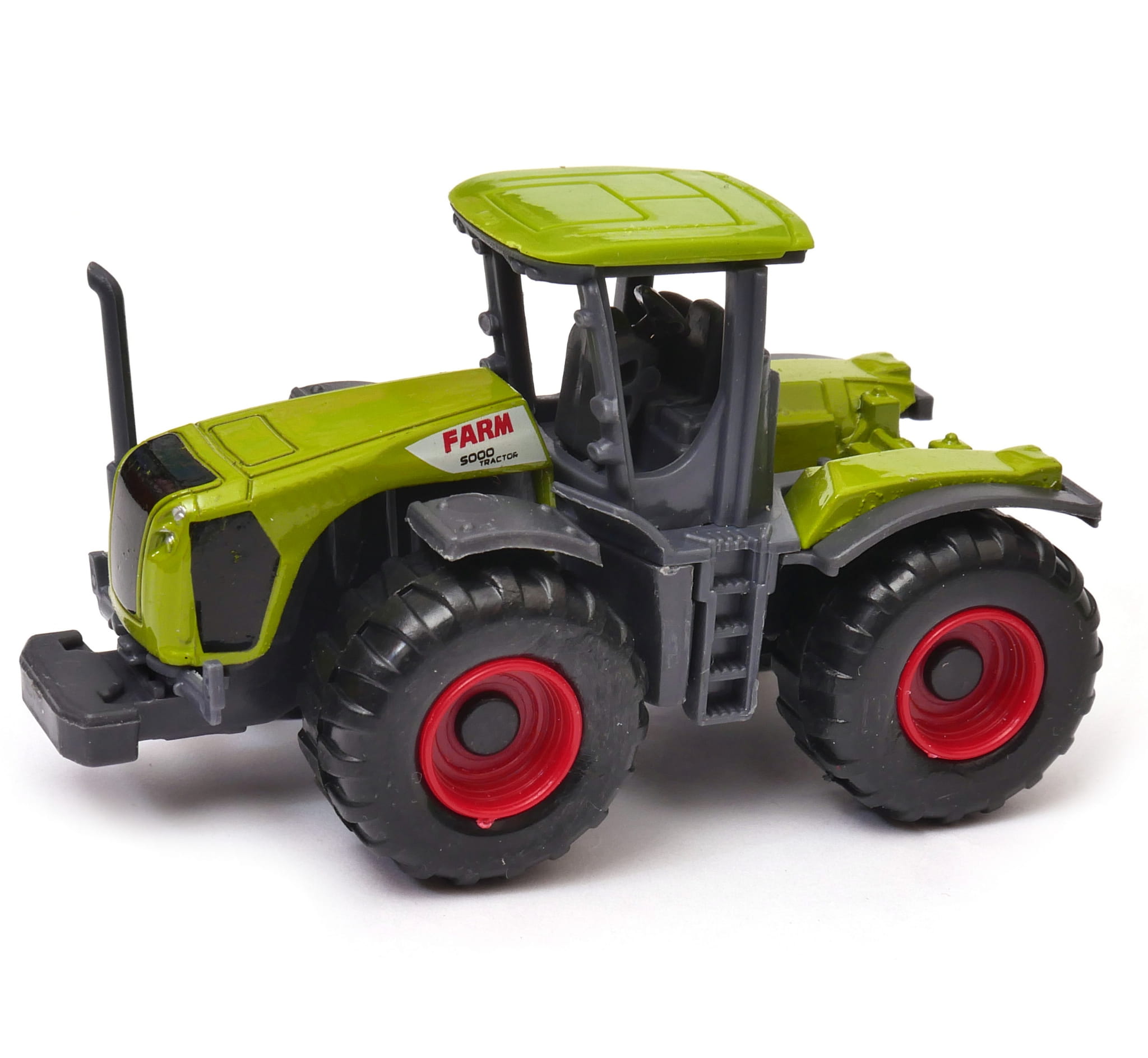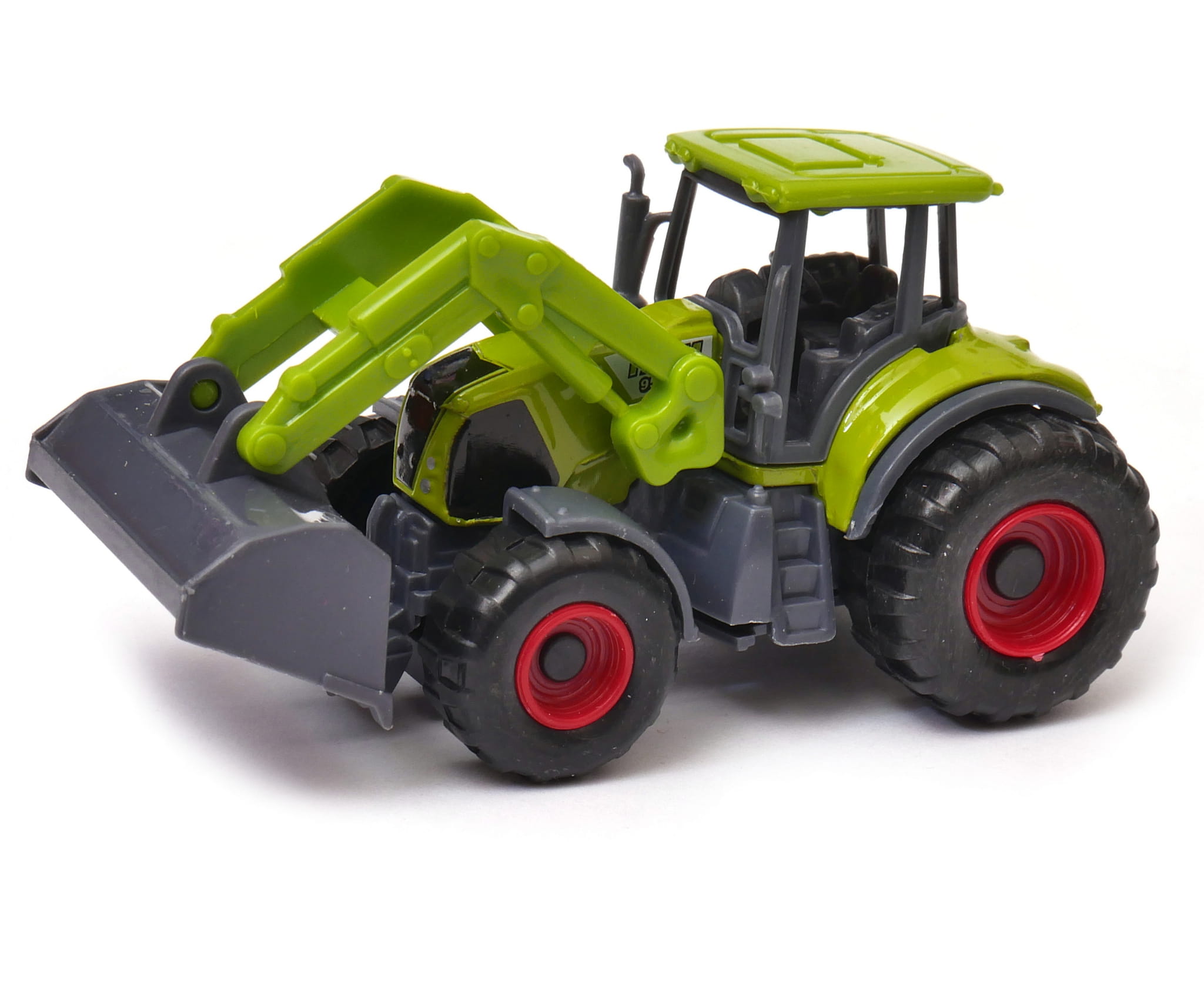 Duży traktor rolniczy z ładowarką ma podnoszoną maskę, a na dachu trzy przyciski włączające reflektory i różne odgłosy. Tylne koła wyposażone są w napęd zamachowy. Zabawkowy ciągnik rolniczy jest dość dokładnie odwzorowany dając dużo satysfakcji z zabawy i będzie pięknie się prezentował na półce z zabawkami.