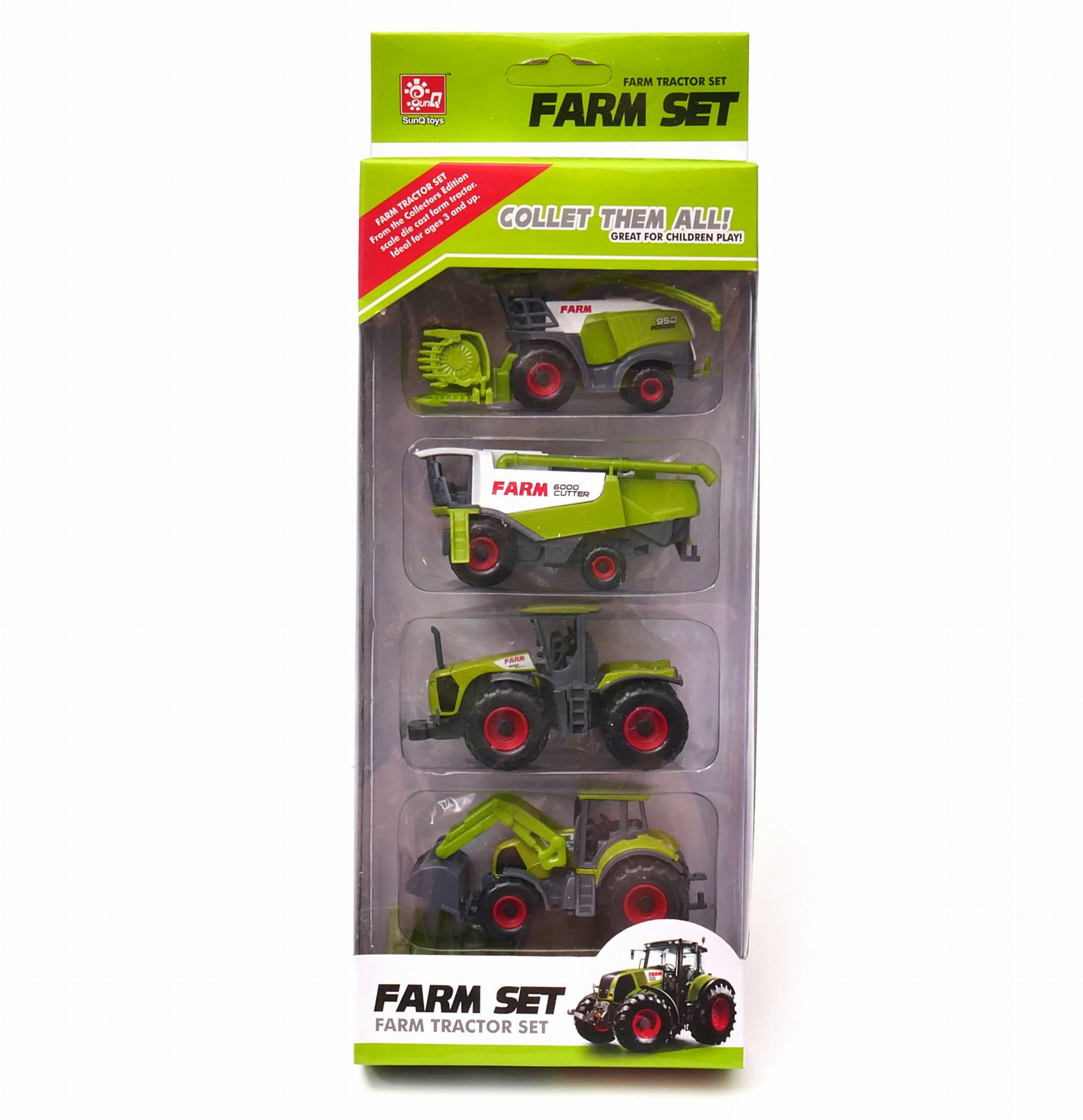 Zestaw składa się z ciągnika rolniczego, kombajnu, wału uprawnego, przyczepy rozsiewacza i prasozwijarki. Dzieci kochają traktory, a taka kolekcja nadaje się na prezent, który pozwoli na zabawę w rolniczą farmę.