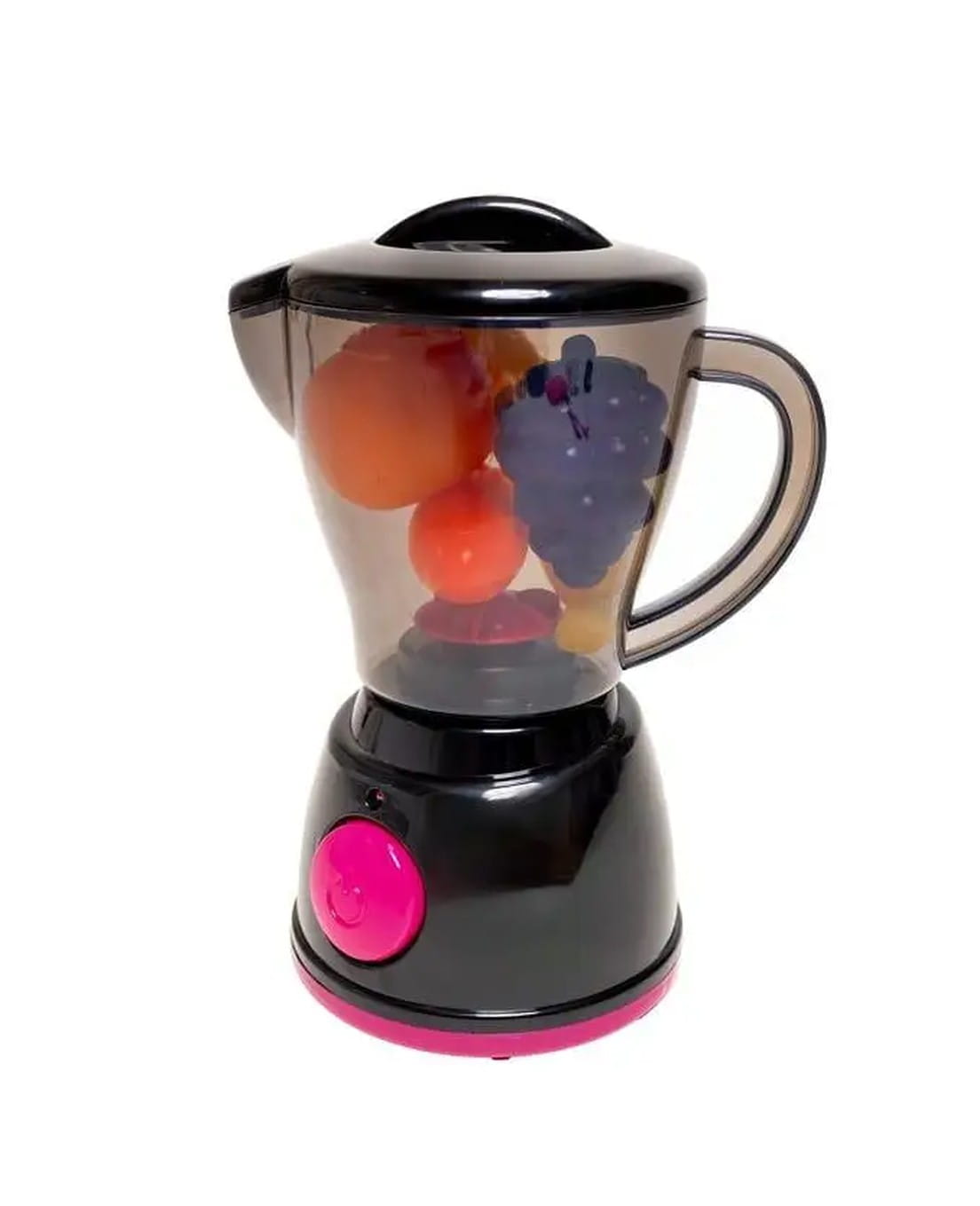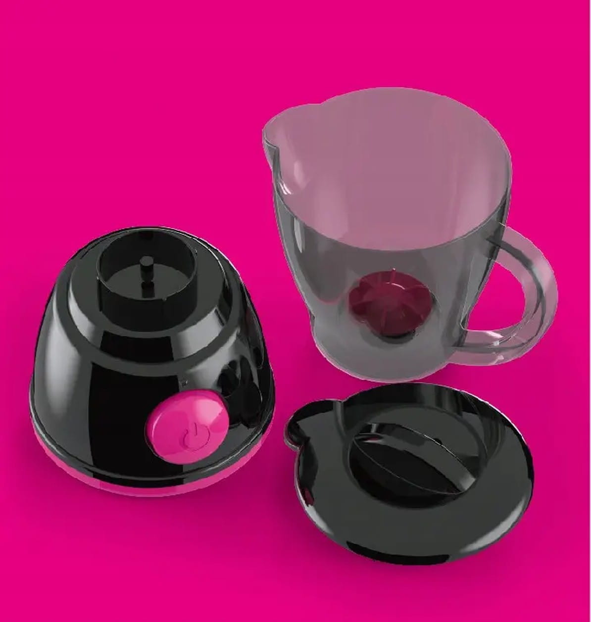 Zabawkowy malakser ma zdejmowany kielich i przykrywkę jak w prawdziwym, a zasilany bateryjnie silnik włącza napęd bezpiecznych plastikowych nożyków.