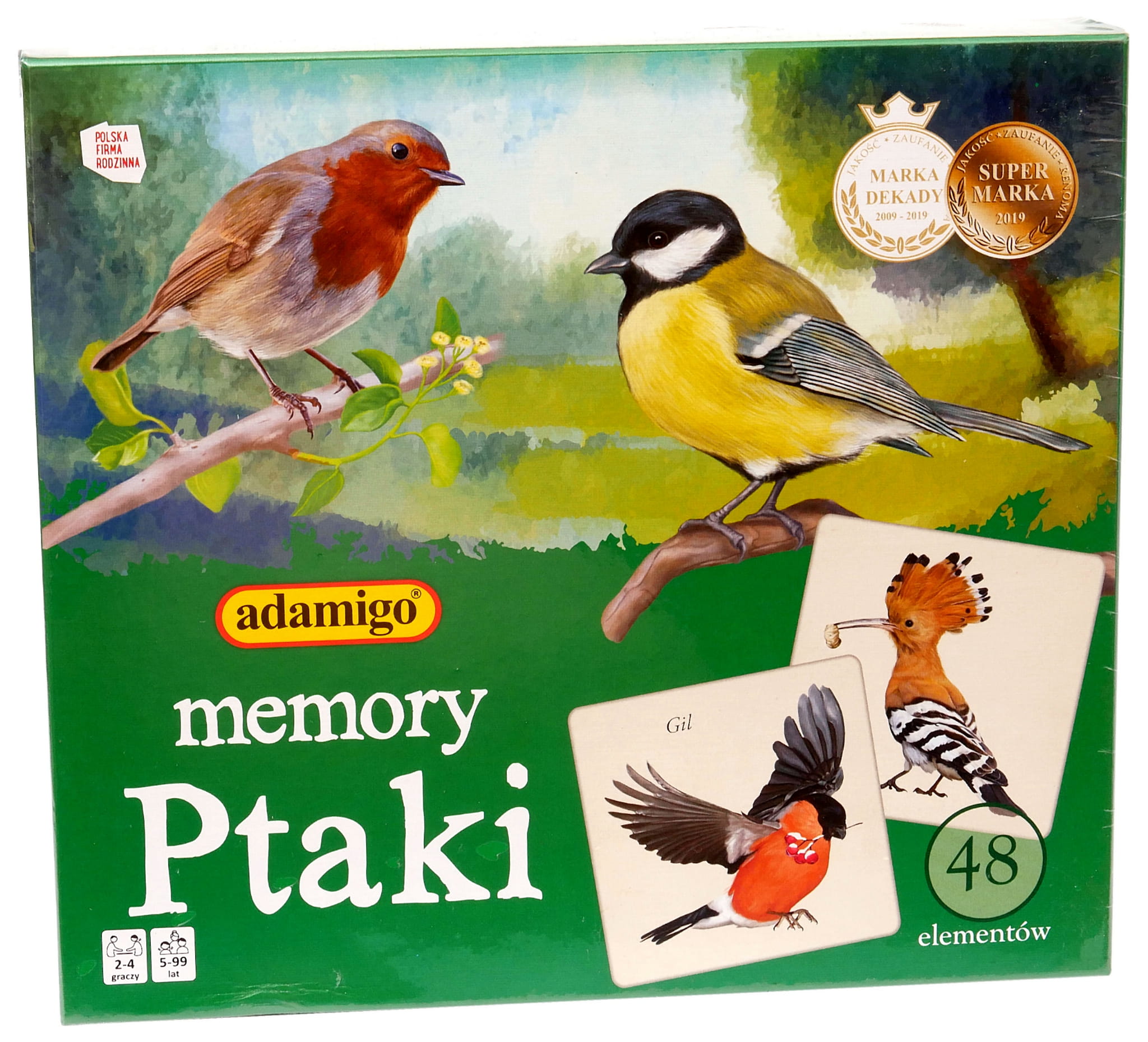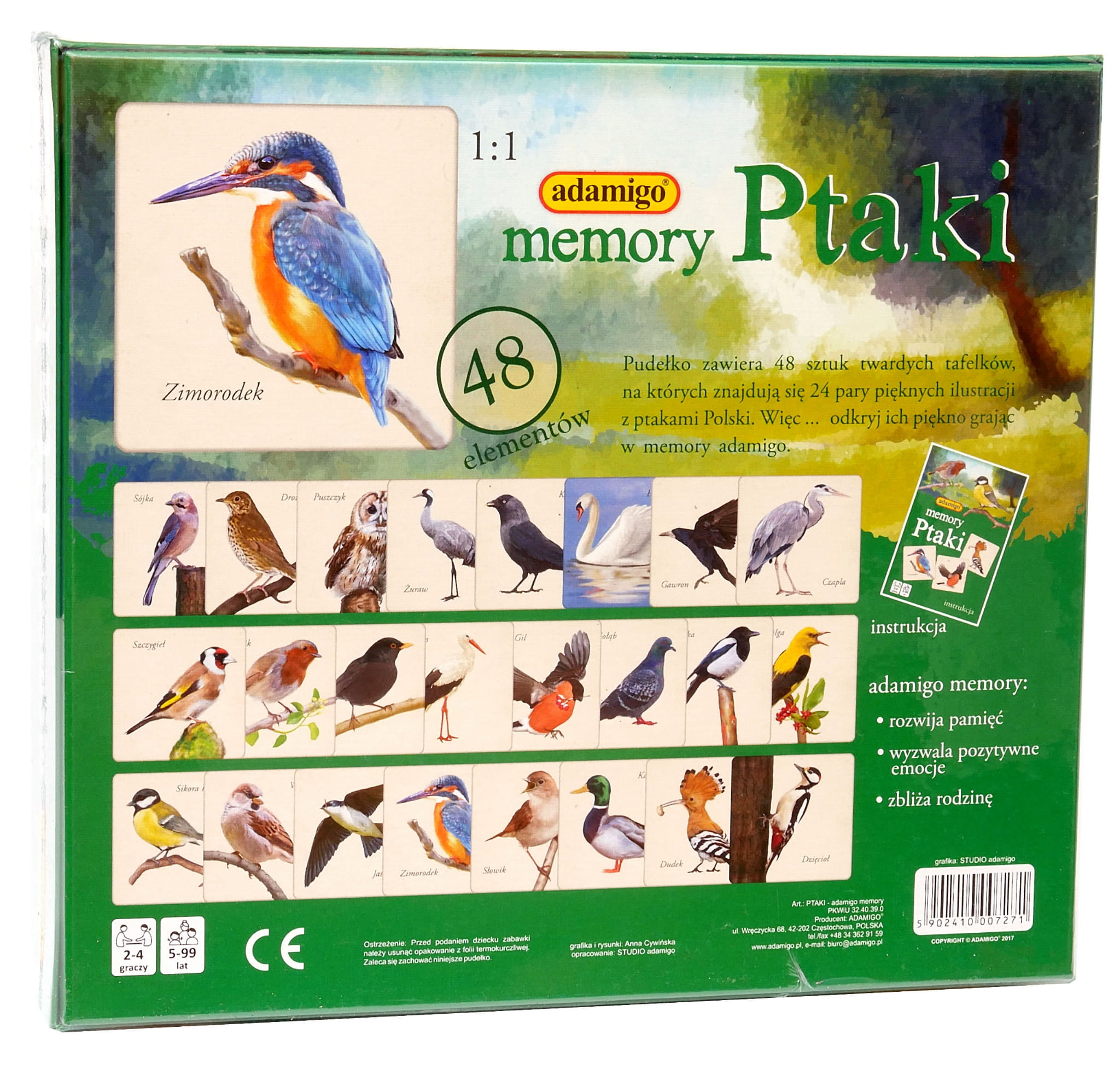 48 kartoników pogrupowanych w pary, mające na jednej stronie takie same obrazki w parze. Jest więc 24 pary i 24 różnych obrazków przedstawiających ptaki polskich lasów i pól.