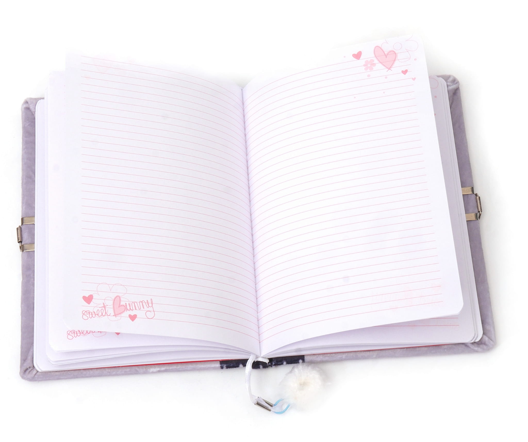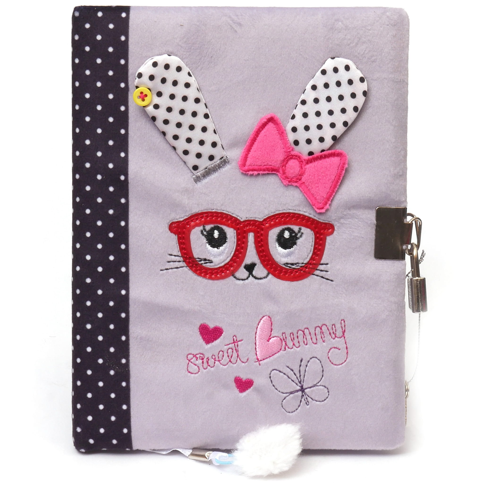 Pamiętnik z kłódką SWEET BUNNY GRAY to wspaniałe miejsce na przechowywanie dziewczęcych tajemnic. Pluszowa okładka jest bardzo miła w dotyku i wykonana z najwyższą jakością. Wnętrze pamiętnika wypełniają kartki z ozdobnymi motywami. Pamiętnik zamykany na kłódkę, posiada 2 kluczyki oraz tasiemkę do przekładania kartek. Ilość kartek – 96 Format - A5 Cechy szczególne – pluszowa okładka, kartki z zadrukiem wewnętrznym, kłódeczka z kluczykami, ozdobna tasiemka