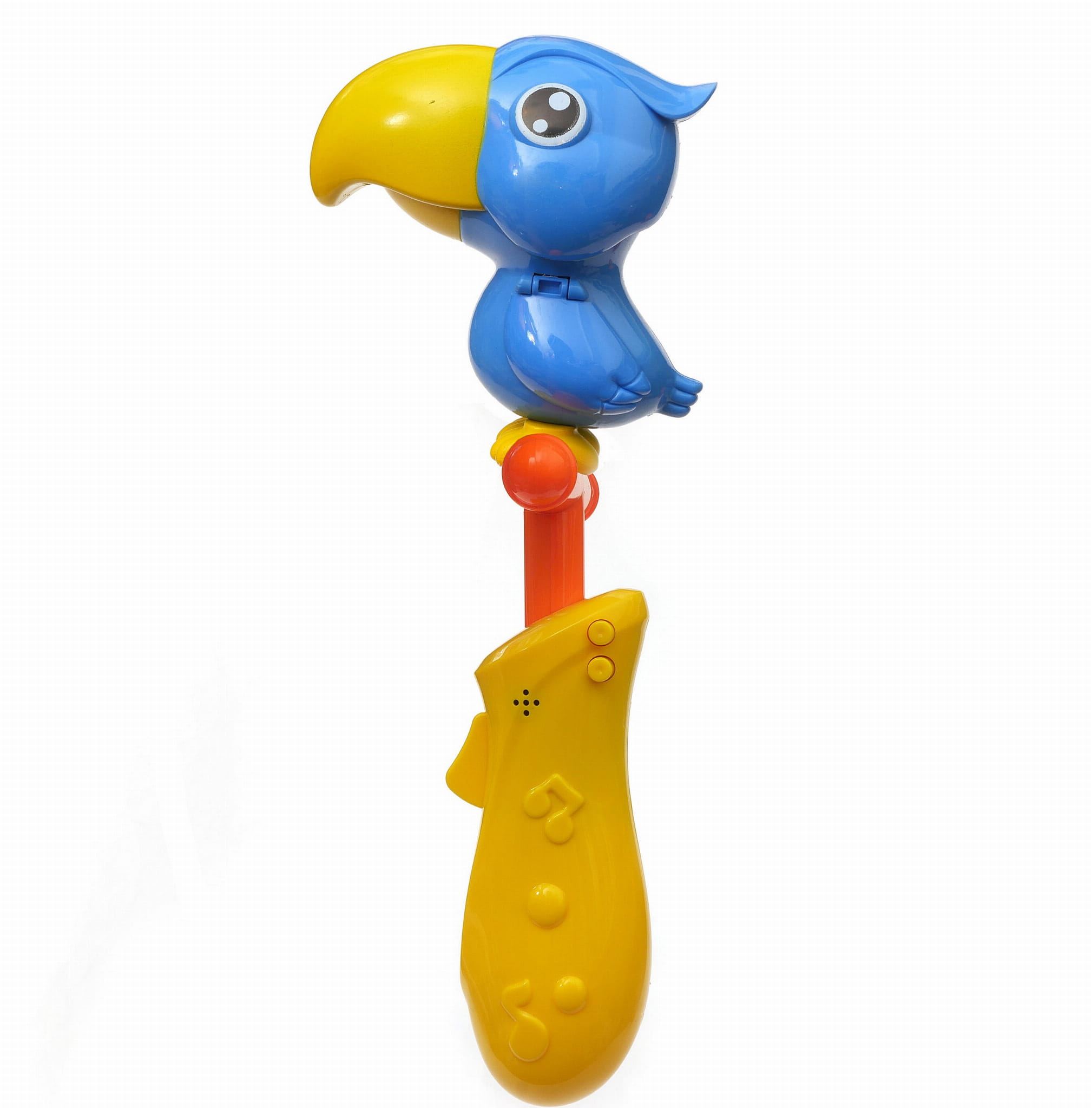 W rączce znajdują się dwa przyciski. Jeden z nich włącza odgłosy natury, a drugi uruchamia funkcję rejestracji głosu. Takie nagranie można odtworzyć wielokrotnie naciskając spust zabawki.