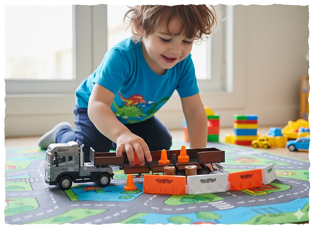 Gotowi na akcję drogową? Ta wyjątkowa ciężarówka z naczepą to nie tylko pojazd – to mobilna baza budowlana, która rozbudza wyobraźnię i daje dzieciom pełną kontrolę nad placem zabaw!