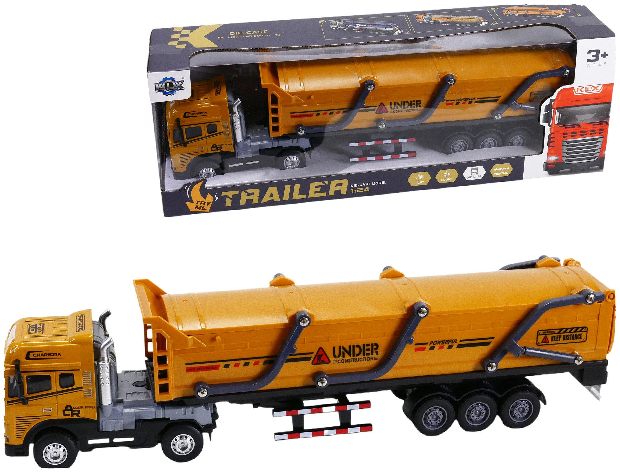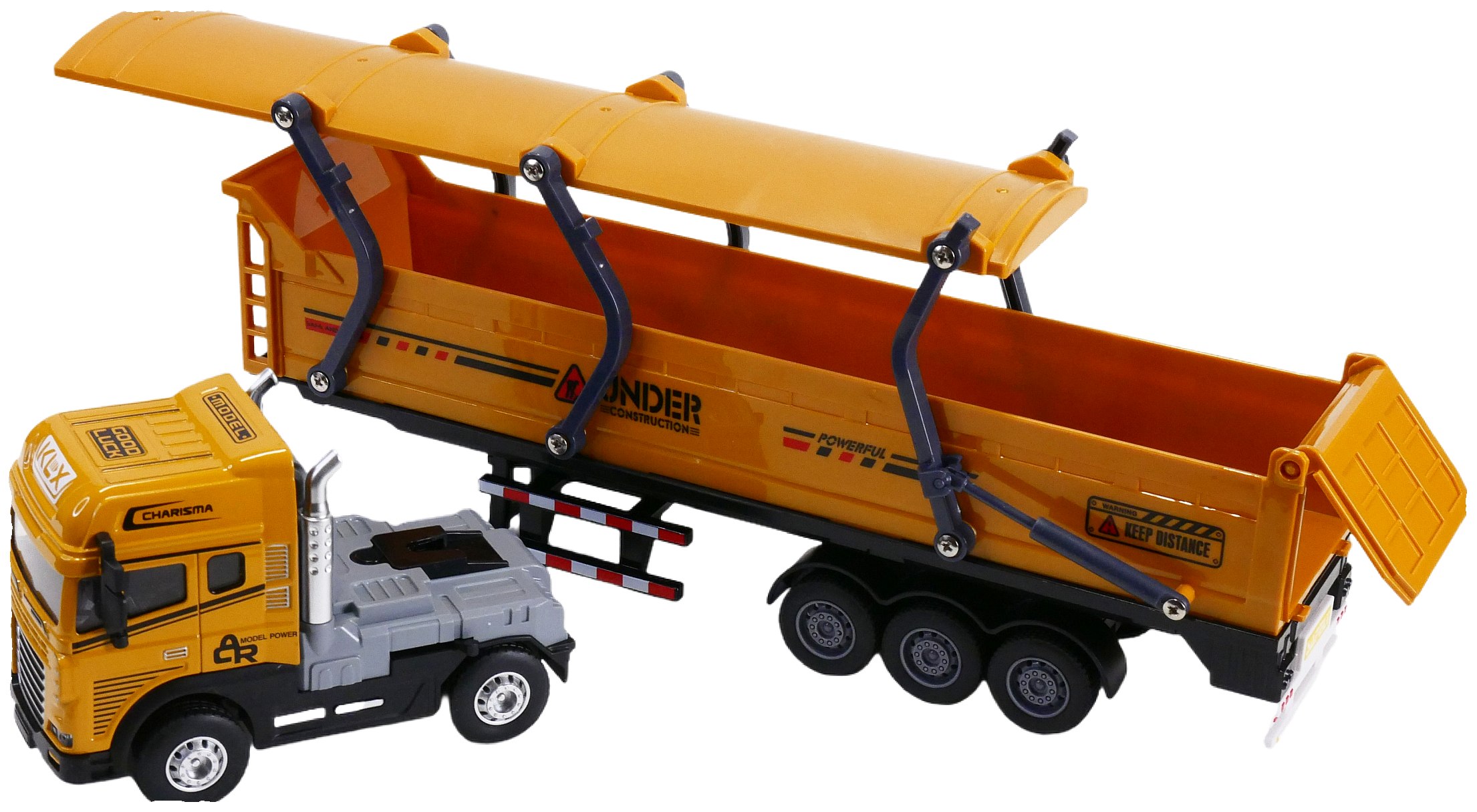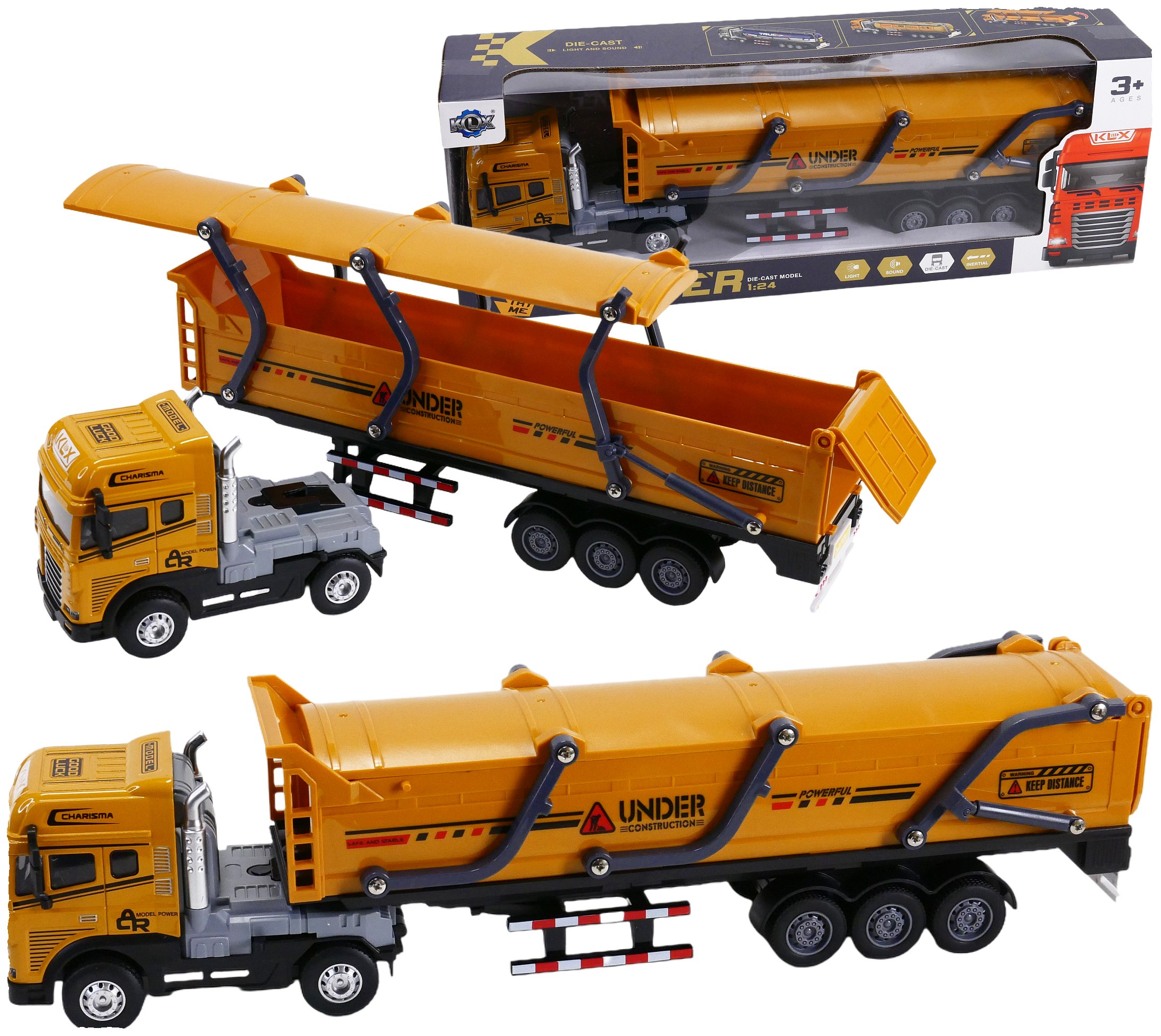 Szukasz wyjątkowej zabawki budowlanej? Duża wywrotka z naczepą to doskonały wybór! Pojazd o długości 40 cm posiada podnoszoną pokrywę skrzyni ładunkowej, metalową karoserię ciągnika siodłowego oraz realistyczne światła i dźwięki. Dzięki ruchomej dźwigni można łatwo odpiąć naczepę. Idealna do zabawy w piaskownicy i rozwijania wyobraźni dziecka. Świetny pomysł na prezent!