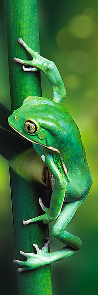 Obrazek na puzzlach przedstawia żabkę wspinającą się po trzcinie.
