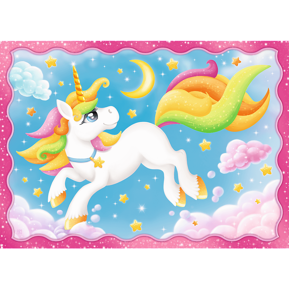 Magiczny Świat Jednorożców to puzzle składające się z 4 niezależnych układanek, zaprojektowane z myślą o wszystkich fanach i fankach baśniowych jednorożców. Po ułożeniu układanek powstaną obrazki o wymiarach 285x205 mm. Zróżnicowana liczba elementów pozwala na zabawę zarówno młodszym, jak i nieco starszym dzieciom. Produkt został wykonany z wysokiej jakości materiałów, z zastosowaniem specjalnego kalandrowanego papieru odbijającego światło, co ułatwia układanie. Produkt został wyprodukowany w Polsce, a do produkcji zostały użyte materiały ekologiczne. Wiek 4+
