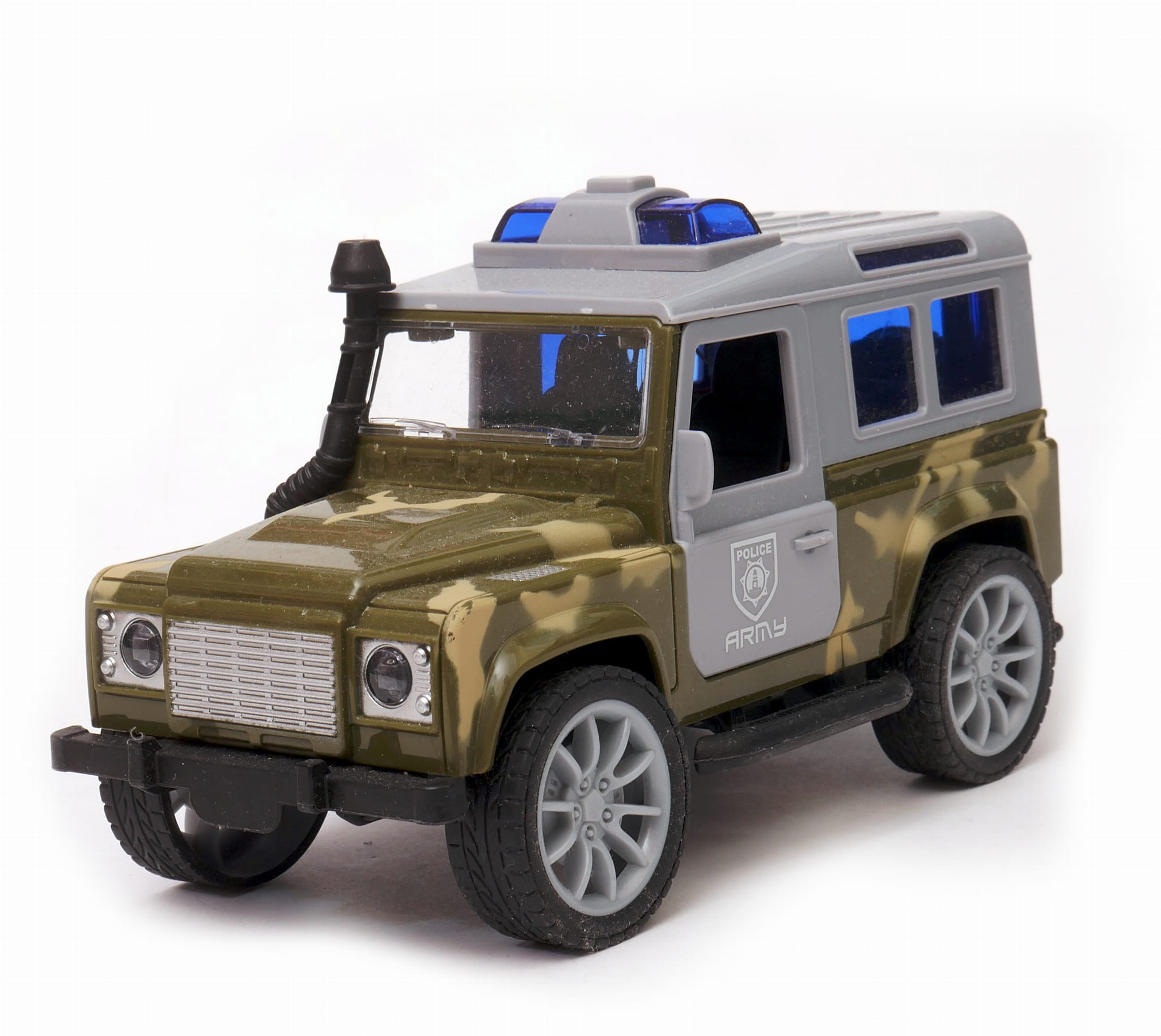 Duży samochód z napędem pull-back. Każde naciśnięcie przycisku włącza dźwięki i sygnały świetlne niebieskie. Samochód wojskowy ma otwierane drzwi i jest również wyposażony w gumowe opony.