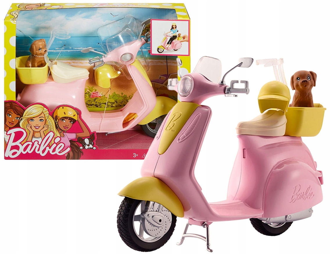 Wyjedź naprzeciw przygodzie z Barbie® na skuterze. Towarzyszyć będzie Ci ukochany zwierzaczek, który zawsze jest gotowy na wycieczkę! Różowo-żółty stylowy skuter zdobią srebrne akcenty. Posadź Barbie® (sprzedawana oddzielnie) na siedzisku ze specjalnym zaczepem, który przytrzyma ją podczas jazdy. Zwolnij podpórkę, aby wyruszyć naprzeciw nowej przygodzie. Szczeniaczka umieść bezpiecznie w żółtym tylnym koszyku. Żółty kask dla Barbie® to gwarancja bezpieczeństwa i dobrego stylu. Bez względu na to, czy wybierasz się na krótką przejażdżkę, czy jedziesz naprzeciw wielkiej przygodzie – ten słodki skuter jest gotowy do drogi! W zestawie skuter dla Barbie® z koszykiem, szczeniaczkiem i kaskiem. Lalka nie znajduje się w zestawie. Kolory i elementy dekoracyjne mogą się różnić.
