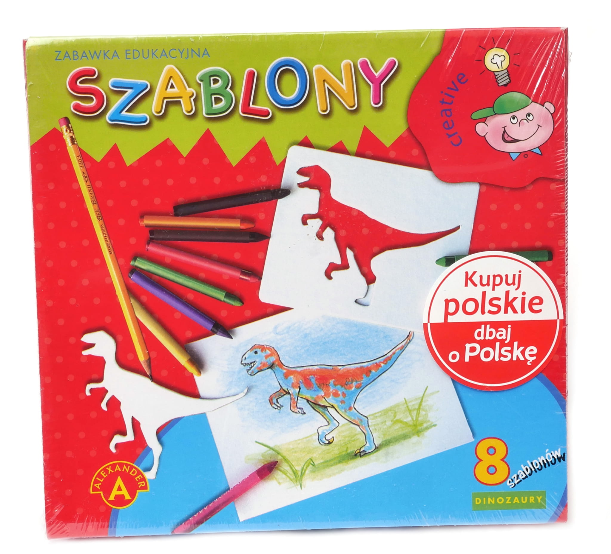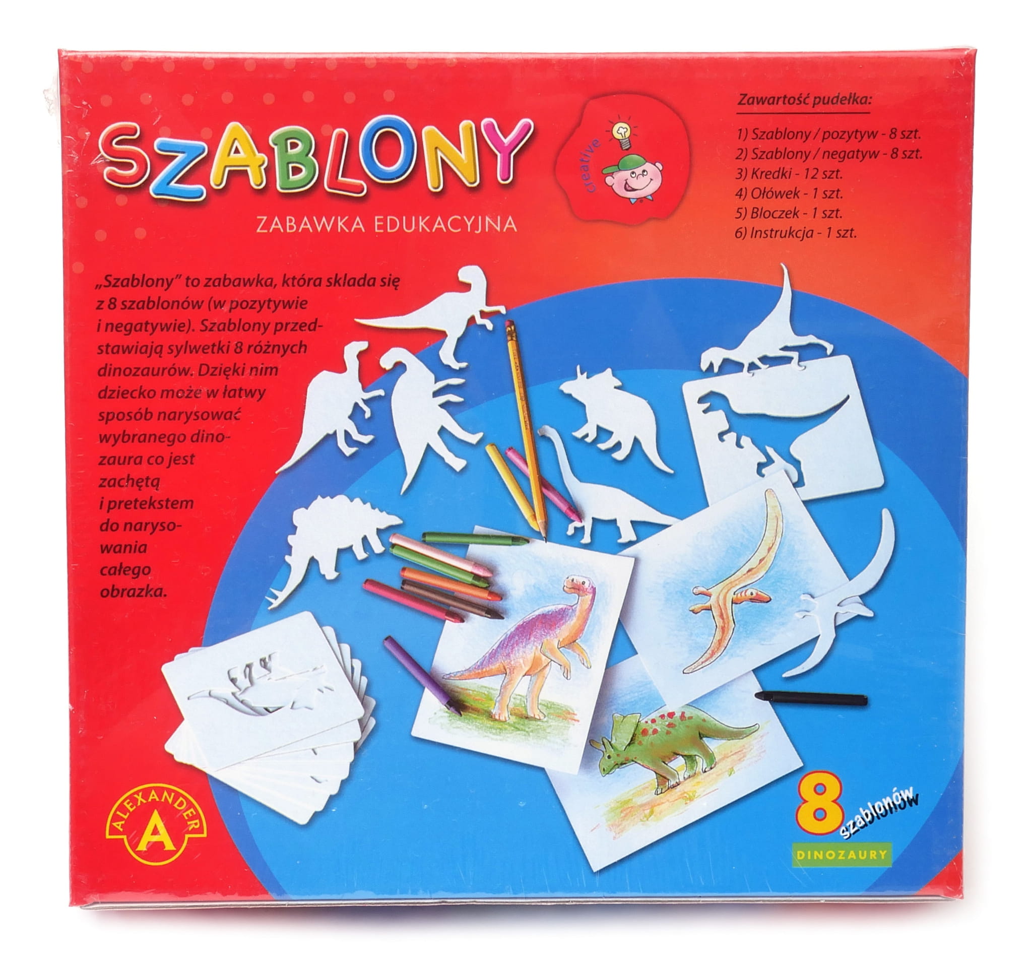 " SZABLONY" to zabawka , która składa się z 8 szablonów( w pozytywie i negatywie). Szablony przedstawiają 8 różnych dinozaurów. Dzięki nim dziecko może w łatwy sposób narysować wybraną sylwetkę wzbogacając ją kolorem i dodatkowymi elementami. Zabawka edukacyjna przeznaczona dla dzieci powyżej lat 4.