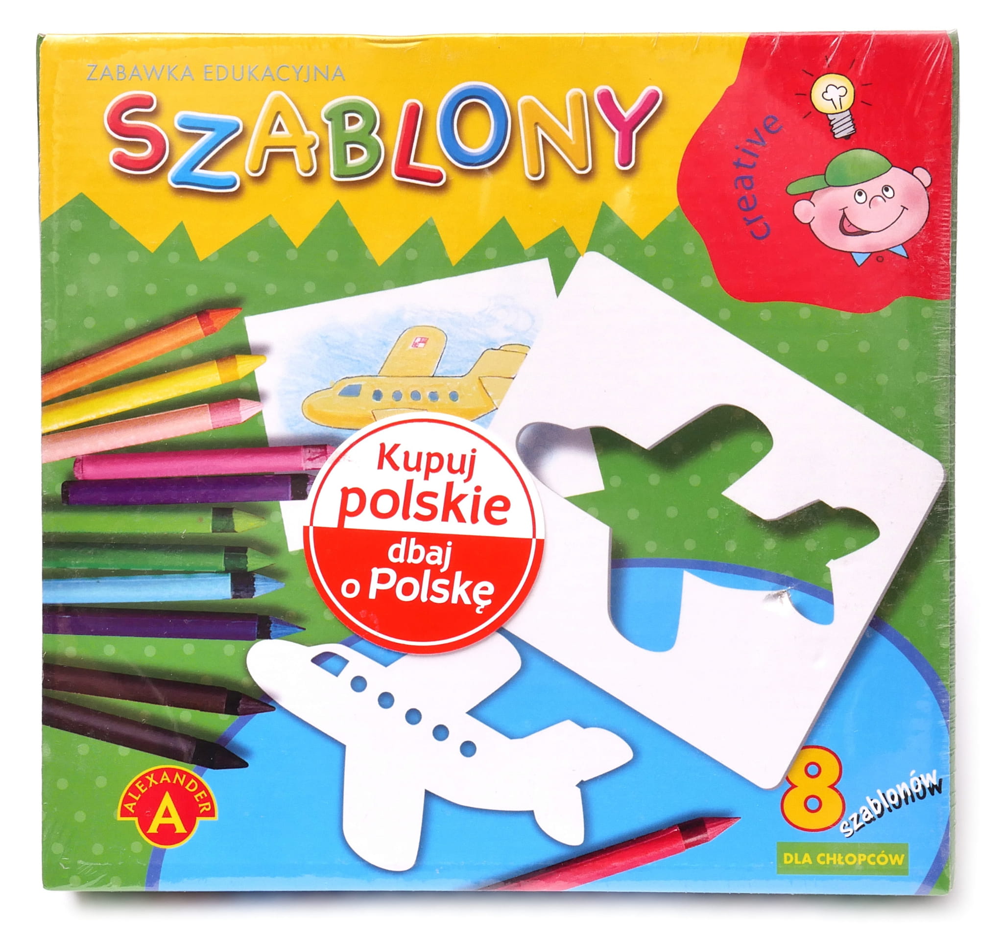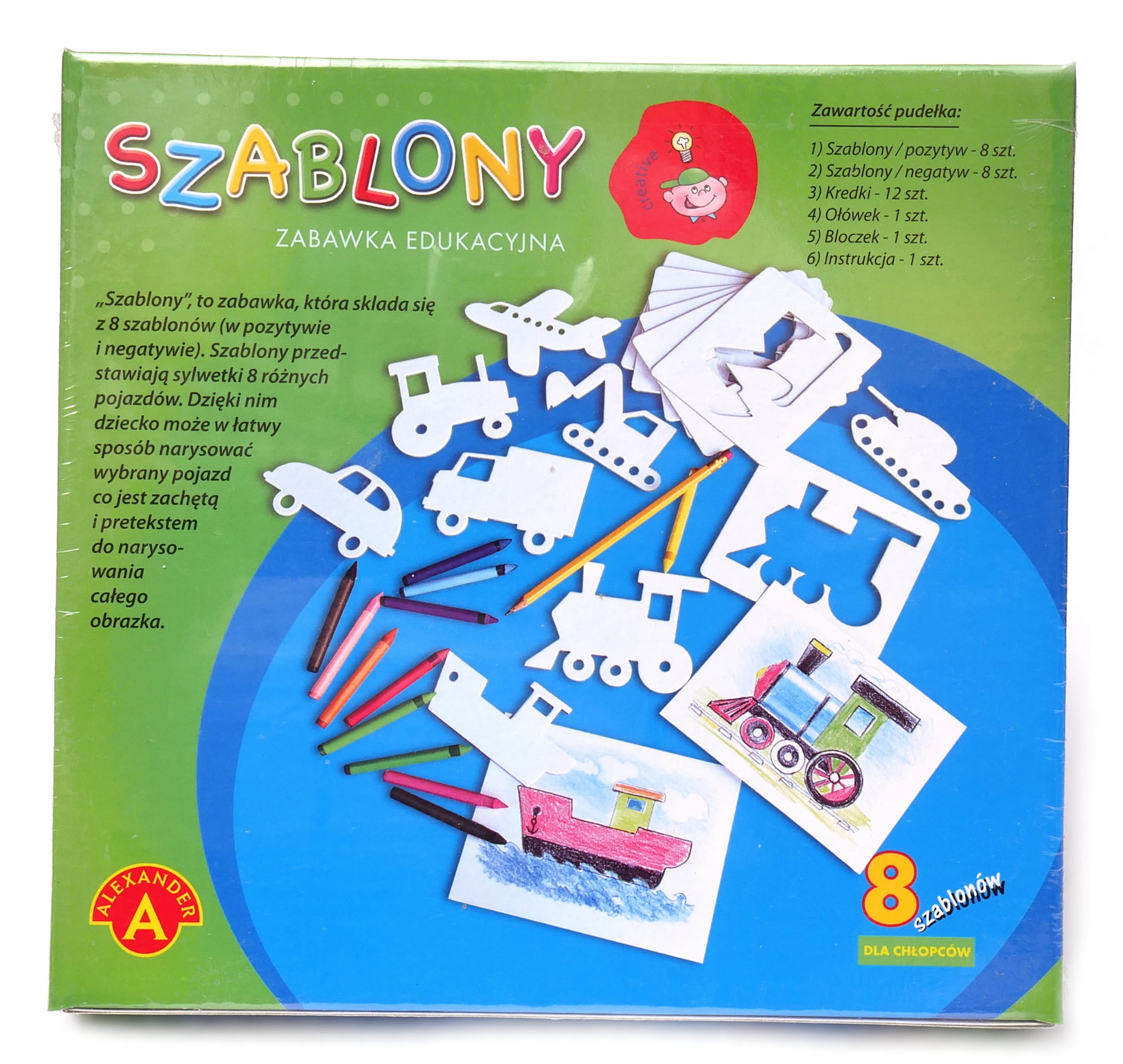 " SZABLONY" to zabawka , która składa się z 8 szablonów( w pozytywie i negatywie). Szablony przedstawiają 8 różnych pojazdów. Dzięki nim dziecko może w łatwy sposób narysować wybraną sylwetkę wzbogacając ją kolorem i dodatkowymi elementami. Zabawka edukacyjna przeznaczona dla dzieci powyżej lat 4.