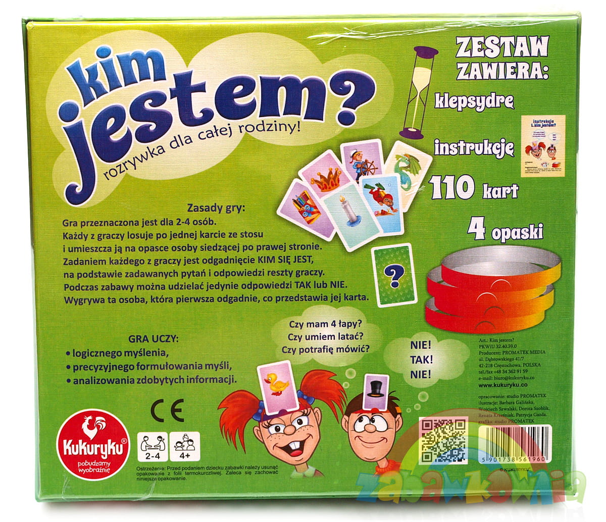 ''Główka zgaduje co czółko pokazuje'' - gra w szybkie zgadywanie dla całej rodziny. Nie widząc swojej karty umieszczonej na czole, zgadnij kim lub czym jesteś zadając pytania, np.: Czy jestem zwierzątkiem Czy mam dziób Zabawa polega na wylosowaniu obrazku bez podglądania co się na nim znajduje i umieszczenie jej w opasce na głowie gracza. Odwróć klepsydrę i zadawaj pytania pozostałym graczom, które pomogą się dowiedzieć KIM JESTEŚ. Odpowiedzią na te pytania może być tylko TAK lub NIE. Jeśli odgadniesz przed upływem czasu wygrywasz. Można zapisywać punkty wygranych i grę zakończyć w momencie gdy jeden ze "zgadywaczy" uzbiera umówioną liczbę punktów. Gra daje mnóstwo radości, a ponadto uczy dzieci logicznego myślenia, precyzyjnego formułowania myśli, komunikacji i analizowania zdobytych informacji.