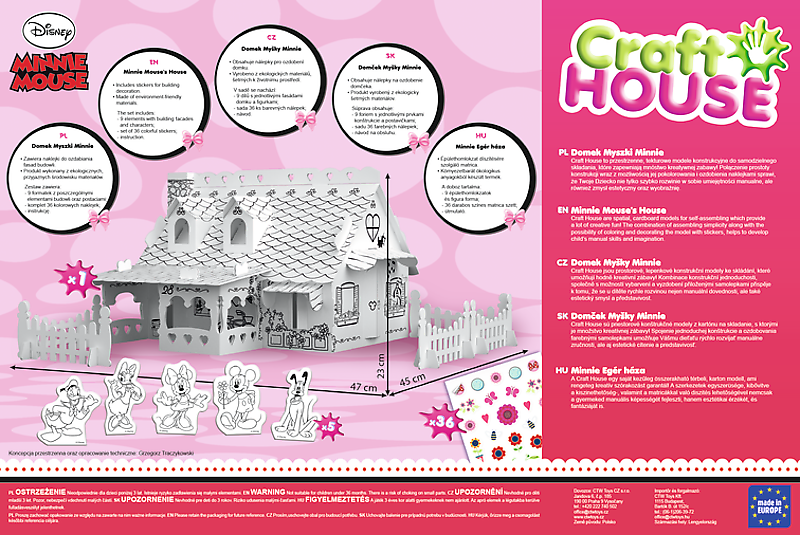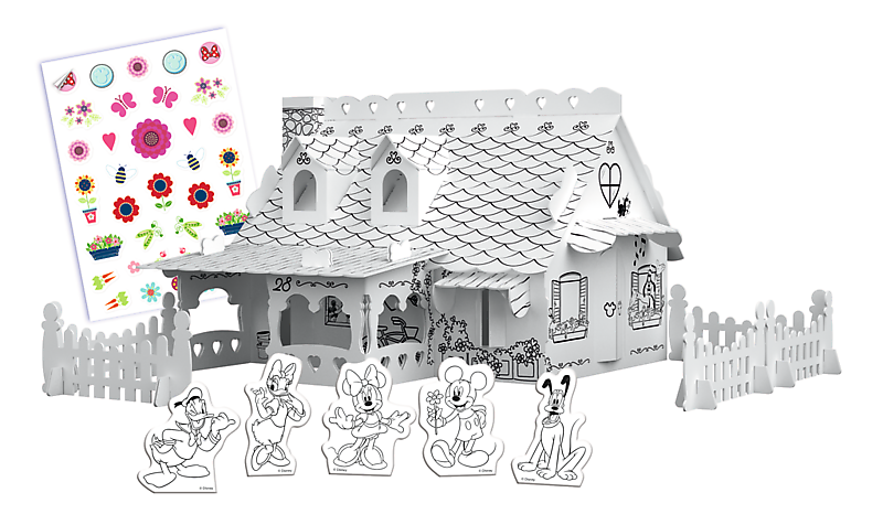 Witamy w świecie Disneya, gdzie Myszka Minnie zaprasza do zabawy w składanie i kolorowanie jej ślicznego domku z ogrodem. Zbuduj tekturowy domek Craft House jaki znasz ze swojego ulubionego filmu. Połącz tekturowe, łatwe do złożenia elementy i pokoloruj je ozdabiając przy tym naklejkami. To prawdziwie kreatywna zabawa rozwijająca zdolności manualne i zmysł estetyczny pobudzając przy tym wyobraźnię. Domek wprost z Krainy Myszki Minnie zaprojektowany został z myślą o dzieciach, a system prostych mocowań pozwala łatwo złożyć wszystkie części budowli. Zestaw został doposażony w naklejki, które uatrakcyjnią zabawę pozwalając na ozdabianie elewacji domku.