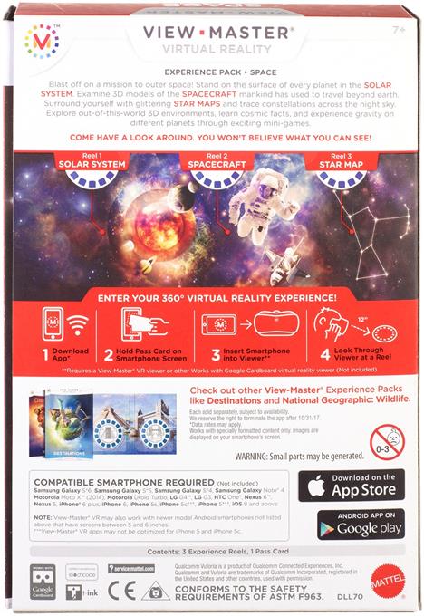 Gogle View Master® to nowoczesny sposób na przeniesienie edukacji do świata wirtualnej rzeczywistości. W połączeniu ze zgodnym smartfonem (nie dołączony do zestawu) i jedną z bezpłatnych aplikacji View-Master® sprawia, że zanurzysz się w trzecim wymiarze oglądając panoramiczne filmy 360 stopni poznając ciekawostki. Będziesz miał również okazję zagrać w minigry. Do gogli dołączony jest krążek zapewniający dostęp do demonstracyjnych wersji dodatkowych rozszerzeń: Kosmos, Ciekawe miejsca i Dzika przyroda.