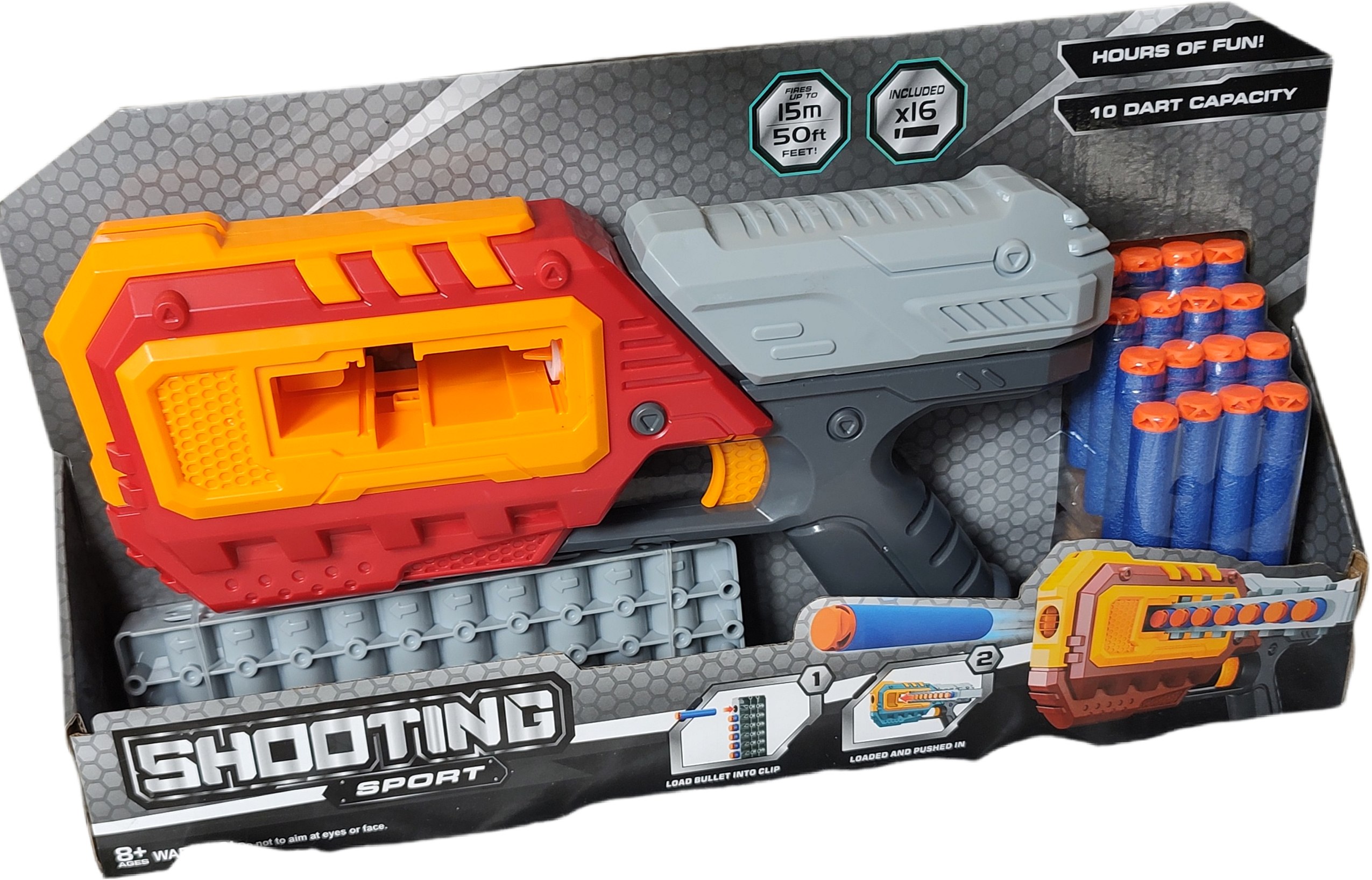 Zapomnij o klasycznych magazynkach! Ten blaster posiada zewnętrzny system podawania amunicji za pomocą specjalnego pasa. Dodaje to realizmu zabawie i pozwala na szybką ocenę, ile strzałek pozostało do wystrzelenia.