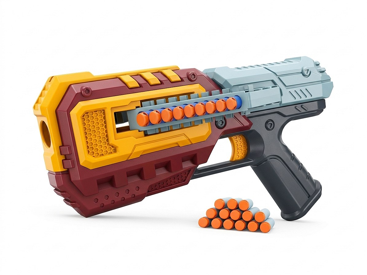 Pistolet CyberBlaster przyciąga wzrok odważną, trójkolorową kolorystyką (bordowy, jaskrawożółty, błękitny), która od razu kojarzy się z nowoczesnymi technologiami i światem science-fiction. Geometryczne kształty, perforowane panele i ergonomiczna rączka sprawiają, że wygląda jak wyjęty prosto z gry wideo.