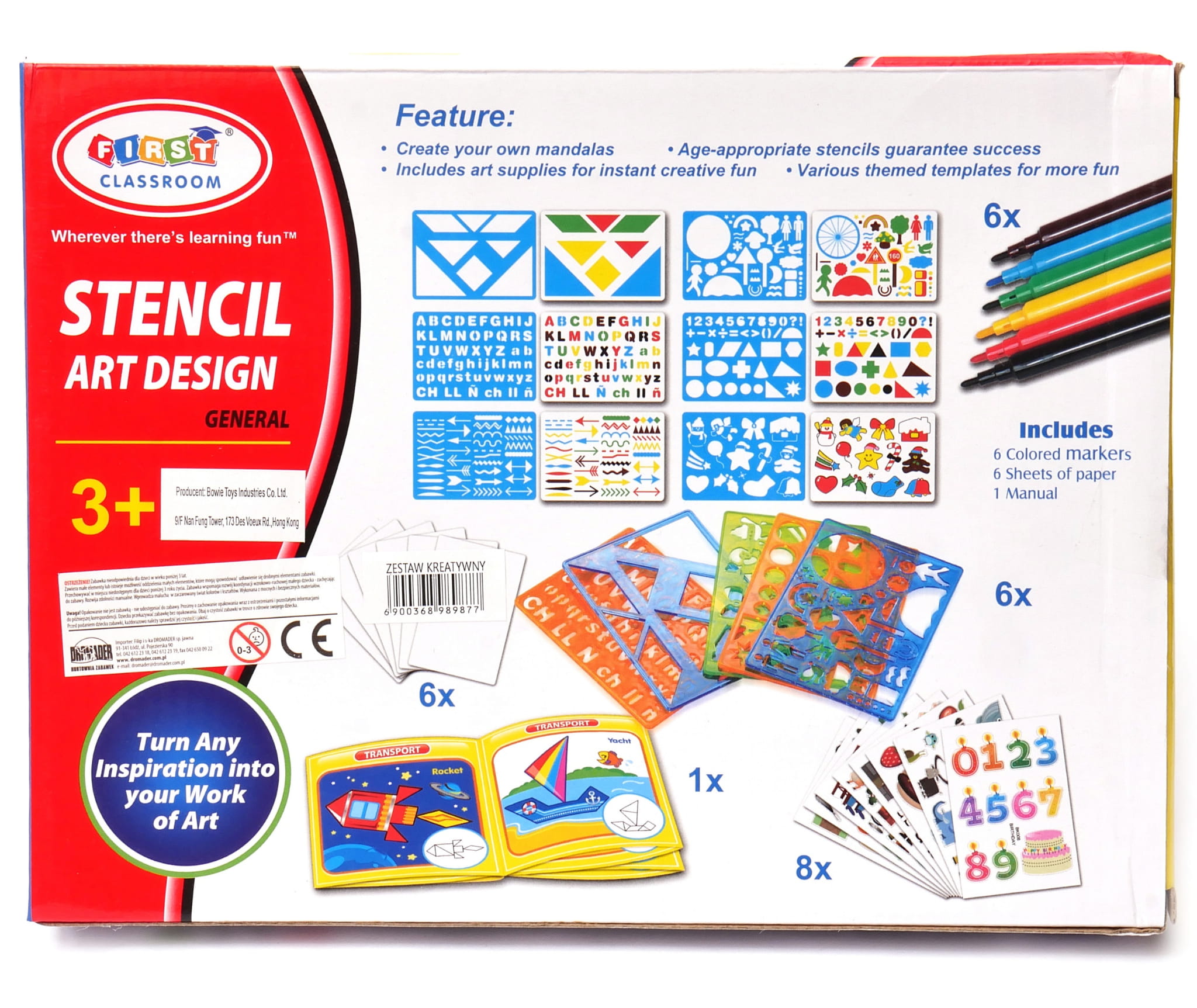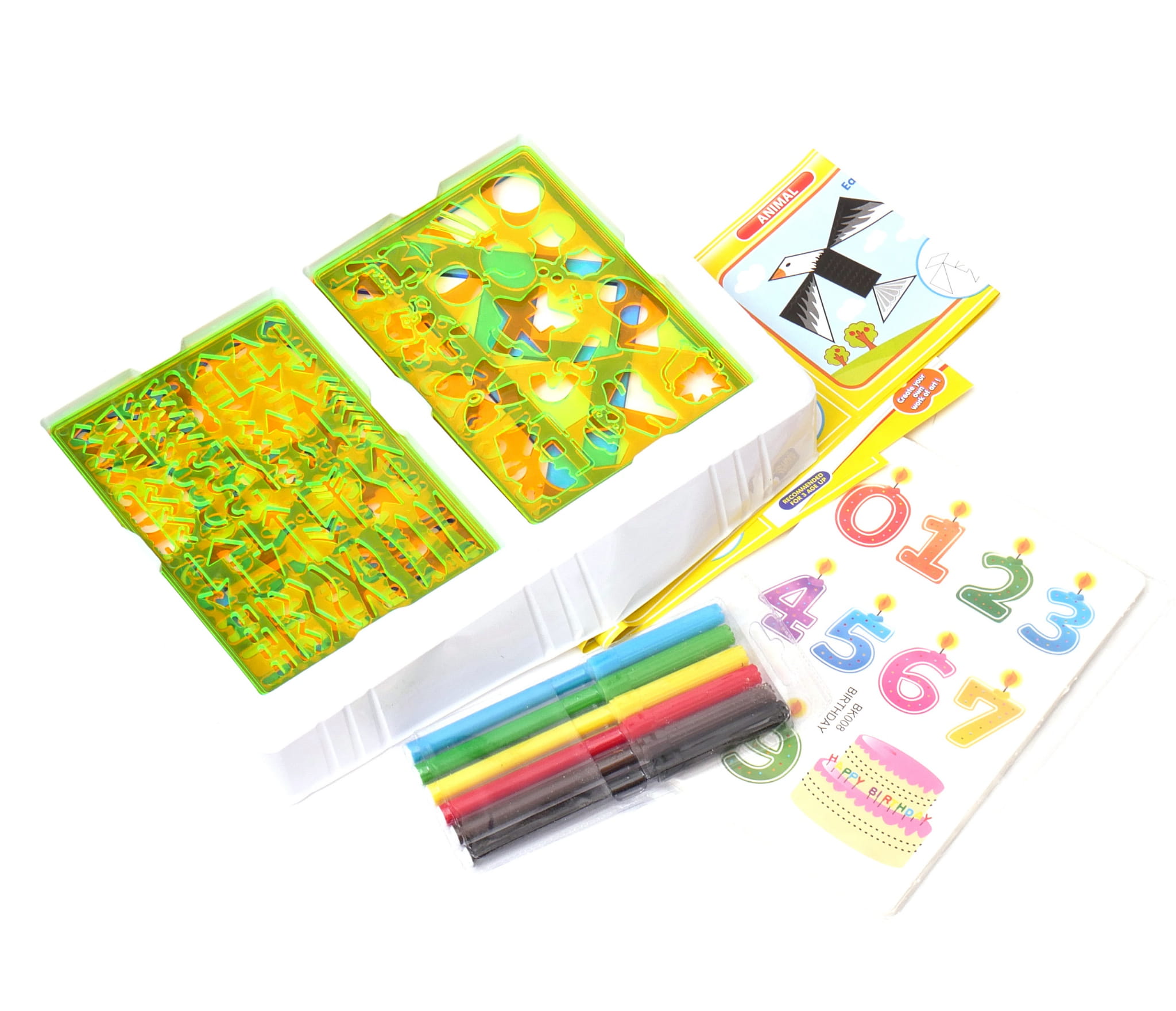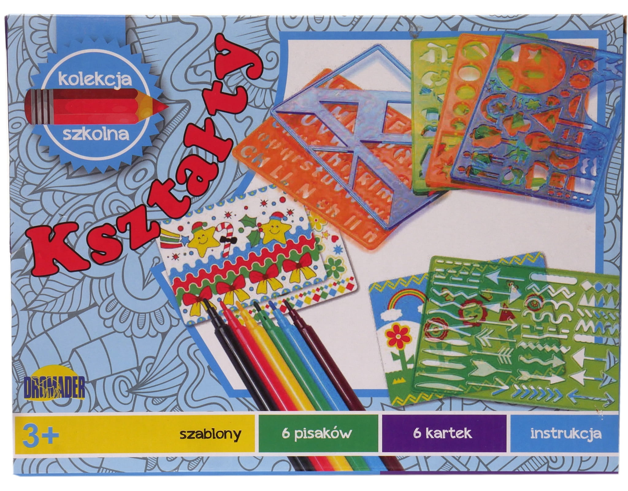 Zestaw zawiera aż sześć tematycznych szablonów, w tym szablony literek i cyfr.
