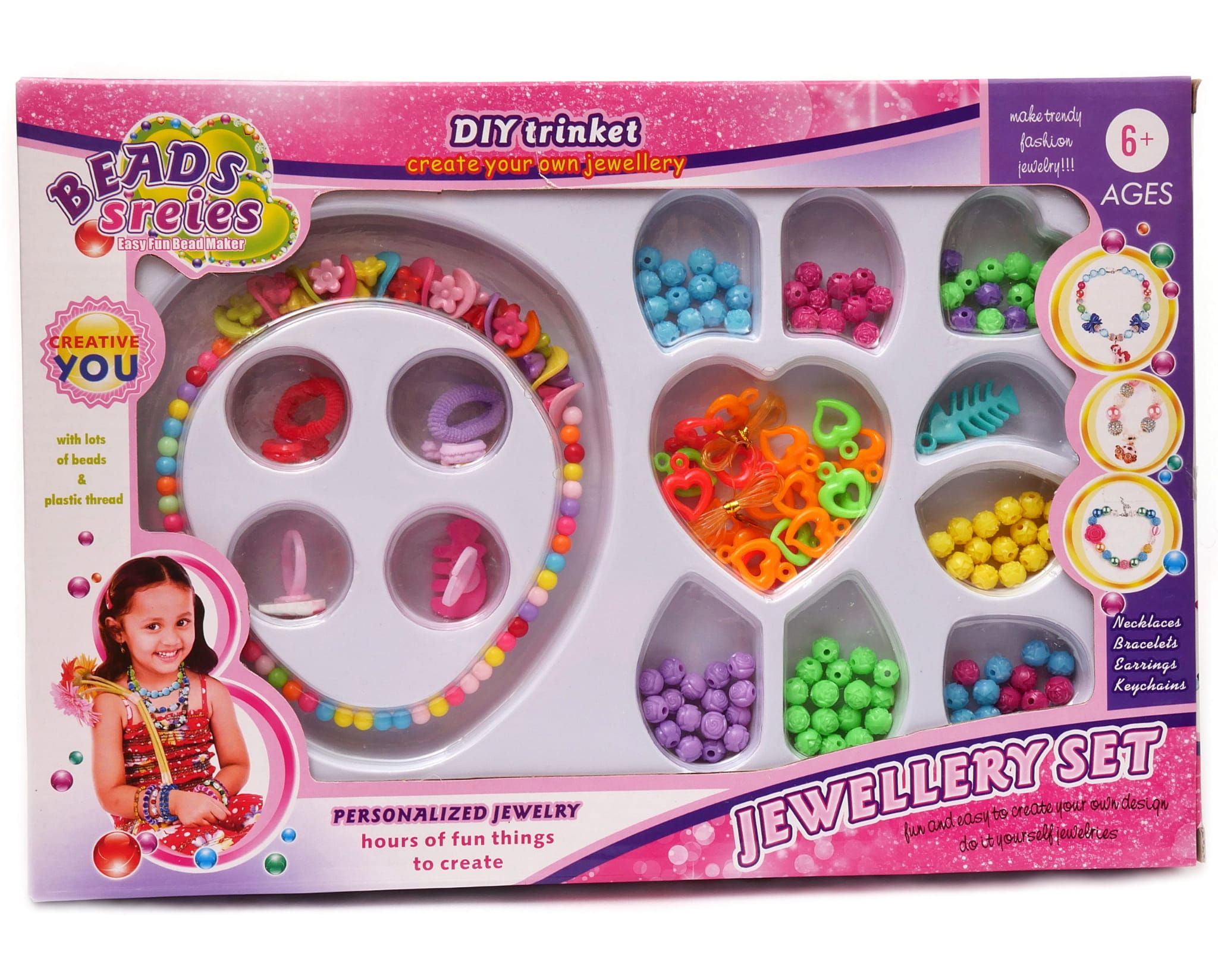 W eleganckim opakowaniu zamknięty został zestaw pełen kolorowych koralików. Paciorki wykonane są z plastiku, a część z nich jest z materiałów przeźroczystych przypominając piękne kryształki. Wykonane z nich naszyjniki i bransoletki będą cieszyły oko każdej dziewczynki tym bardziej.