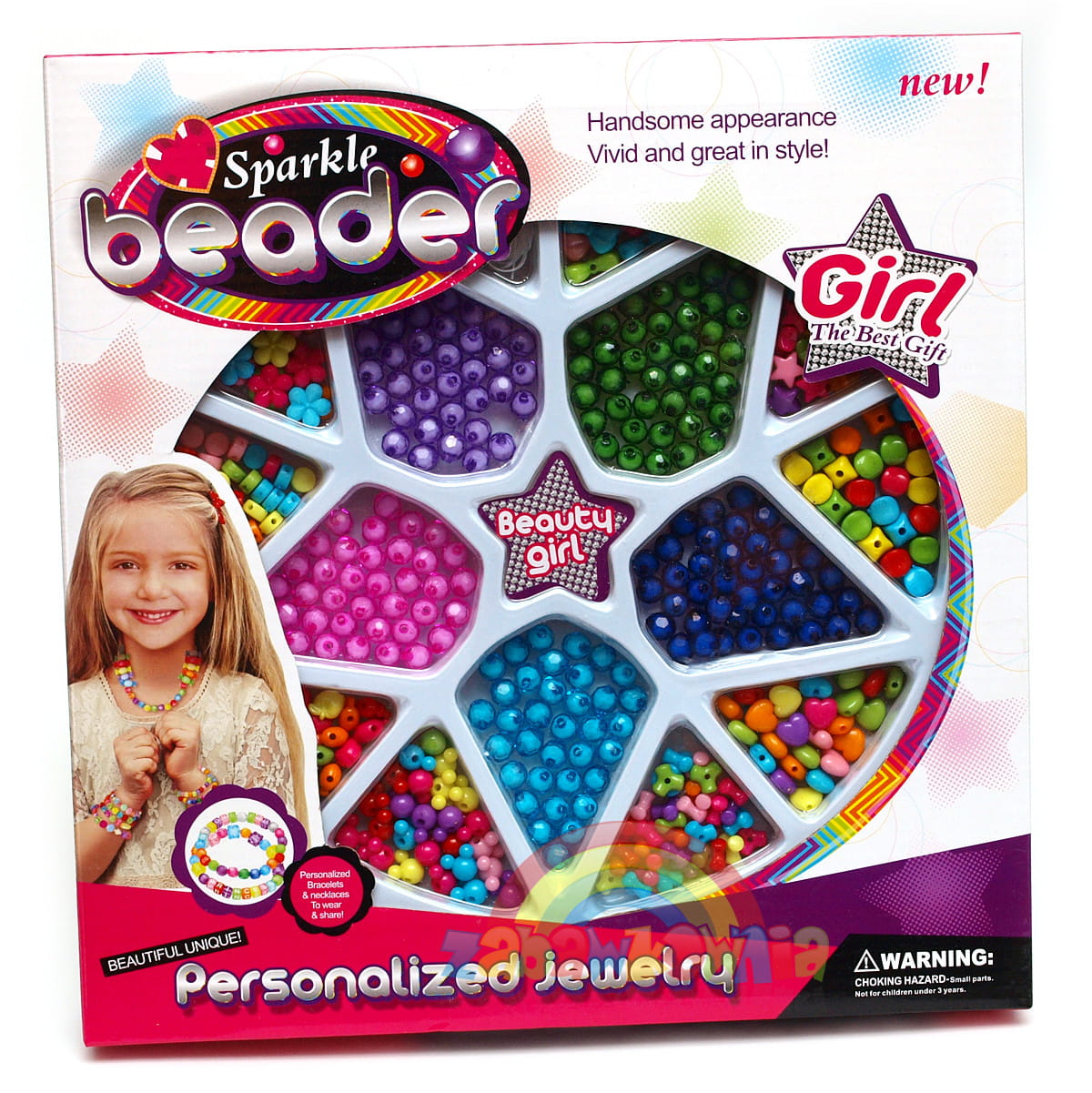 W eleganckim opakowaniu zamknięty został zestaw pełen kolorowych koralików. Paciorki wykonane są z półprzeźroczystego i kolorowego tworzywa, które pięknie mienią się w świetle słońca. Wykonane z nich naszyjniki i bransoletki będą cieszyły oko każdej dziewczynki tym bardziej, że wykonane zostały własnoręcznie. Oprócz koralików kryształowych wykonanych w pięciu wersjach kolorystycznych znajdziemy paciorki w intensywnych kolorach w najróżniejszych kształtach takich jak kwiatki, kokardki, gwiazdki, serduszka, jabłuszka oraz innych.