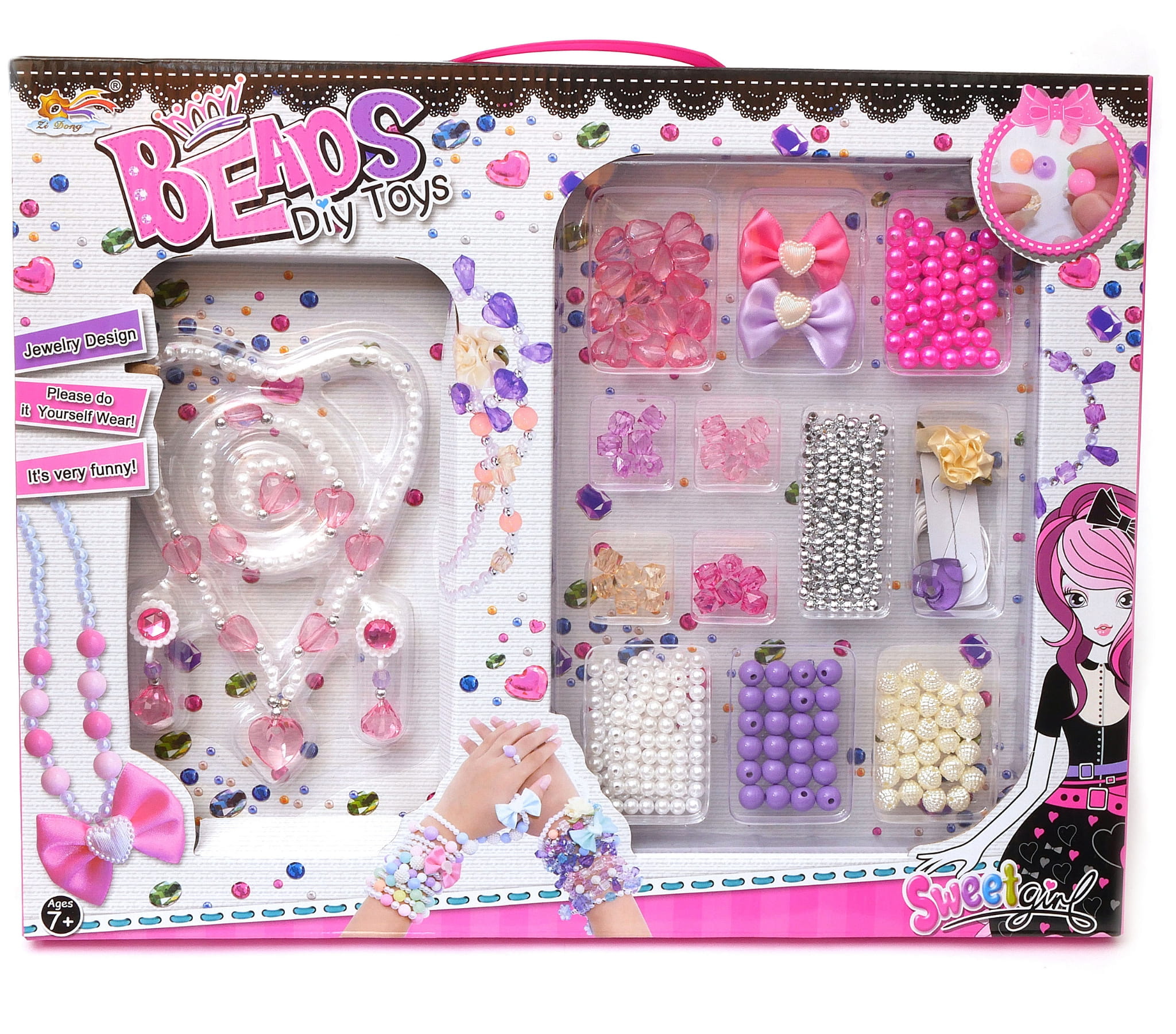 W eleganckim opakowaniu zamknięty został zestaw pełen kolorowych koralików. Paciorki wykonane są z plastiku, a część z nich jest z materiałów przeźroczystych przypominając piękne kryształki i perły. Wykonane z nich naszyjniki i bransoletki będą cieszyły oko każdej dziewczynki tym bardziej.