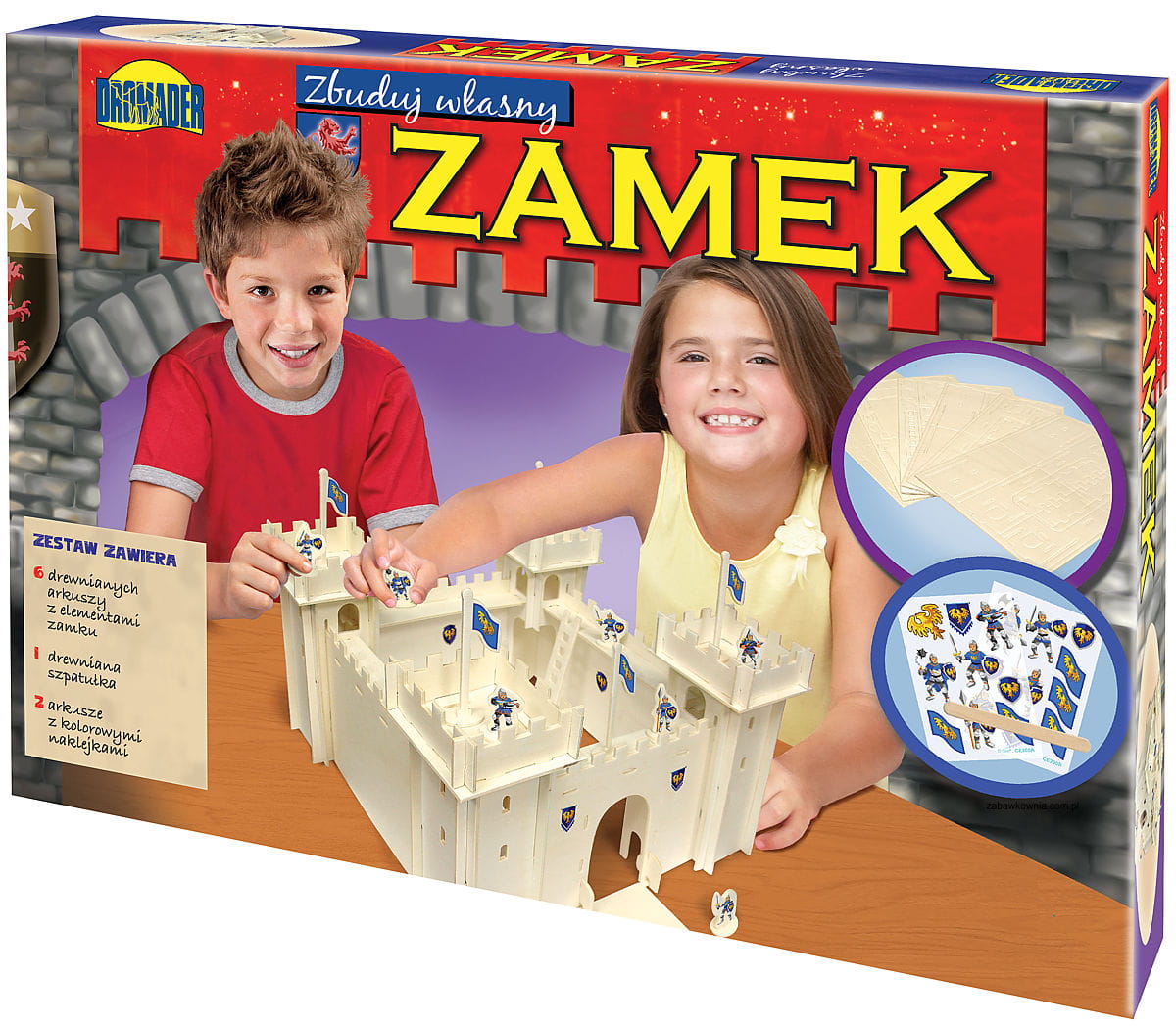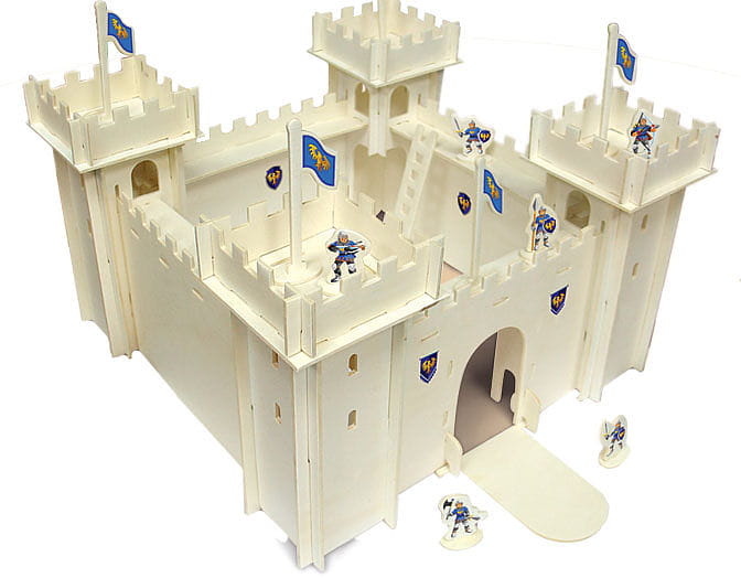Zestaw "zbuduj własny ZAMEK" pozwala na złożenie dużej drewnianej fortecy rycerskiej, która będzie schronieniem dla samodzielnie wykonanych figurek rycerzy. Chłopcy dzięki specjalnym łączeniom będą mogły całość złożyć samodzielnie bez potrzeby użycia kleju. Wszystkie elementy takie jak ściany, podłogi, figurki są wycięte. Wystarczy je wycisnąć z arkuszy i poskładać zgodnie z obrazkową instrukcją, by powstał okazały zamek. Dodatkowo w zestawie chłopcy znajdą specjalne kalkomanie, którymi będą mogły przyozdabiać samodzielnie wybudowane zamczycho. Dodatkowo dziewic będą mogły w łatwy sposób malować i przyozdabiać mury mazakami lub farbami.