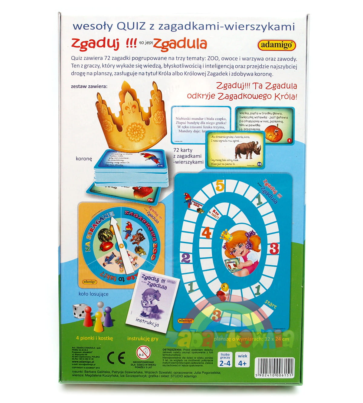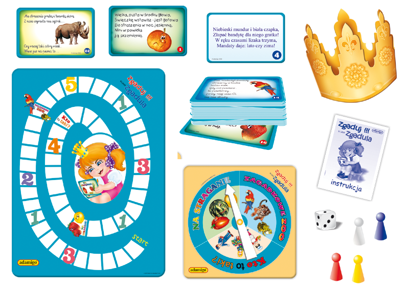 Quiz zawiera 72 zagadki pogrupowane na trzy tematy: ZOO, owoce i warzywa oraz zawody. Ten z graczy, który wykaże się wiedzą, błyskotliwością i inteligencją oraz przejdzie najszybciej drogę na planszy, zasługuje na tytuł Króla albo Królowej Zagadek i zdobywa koronę.
