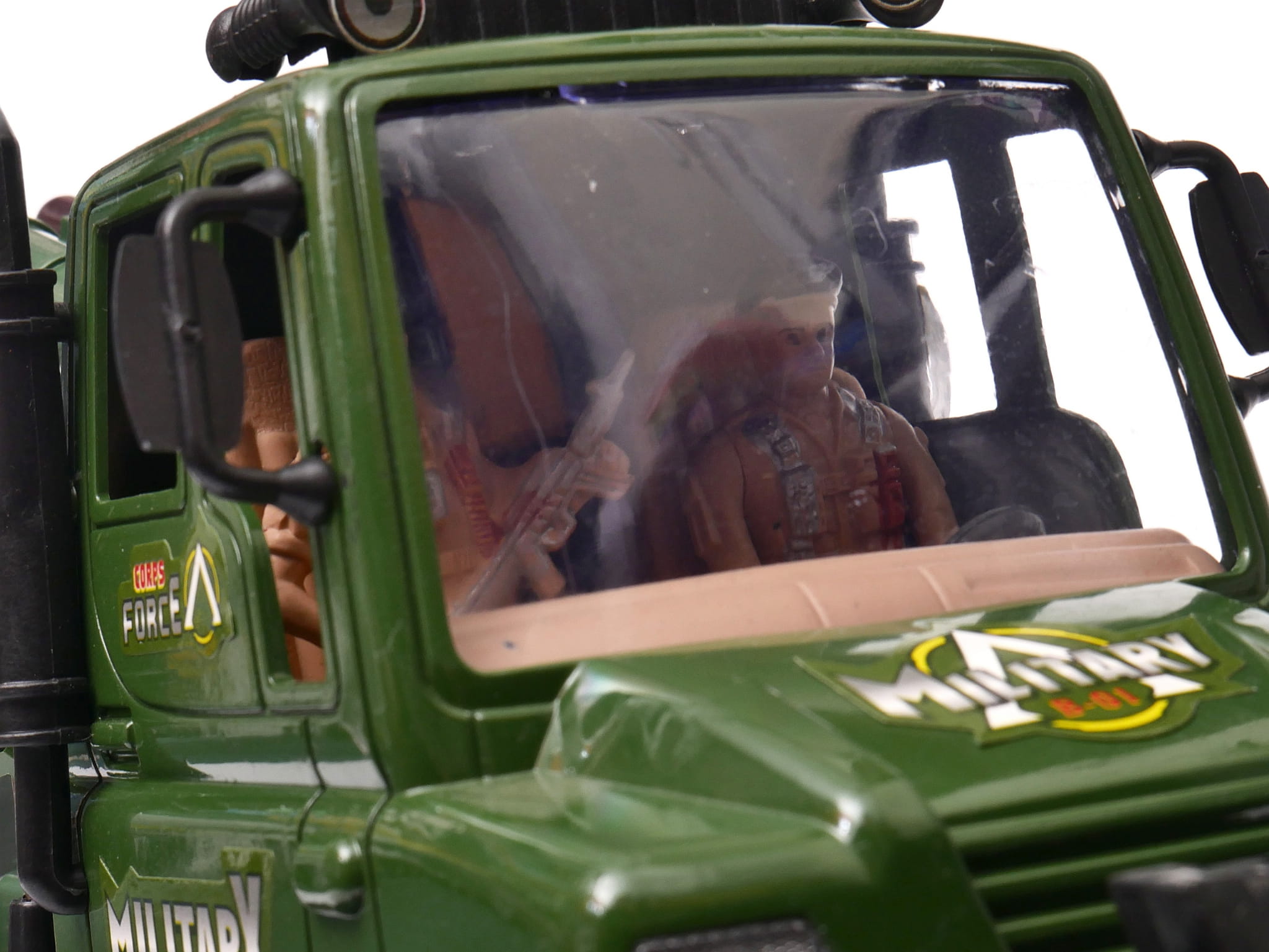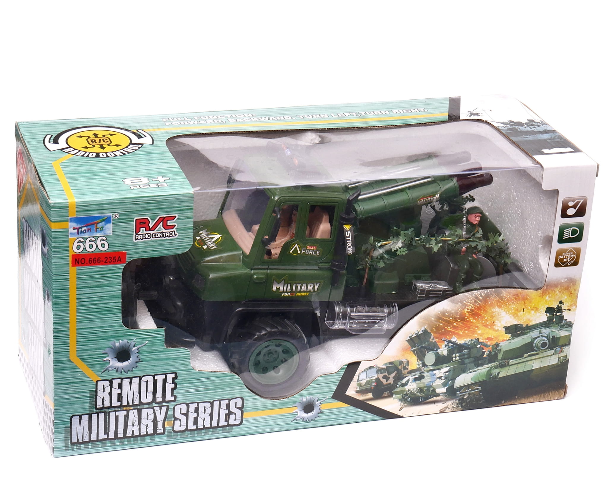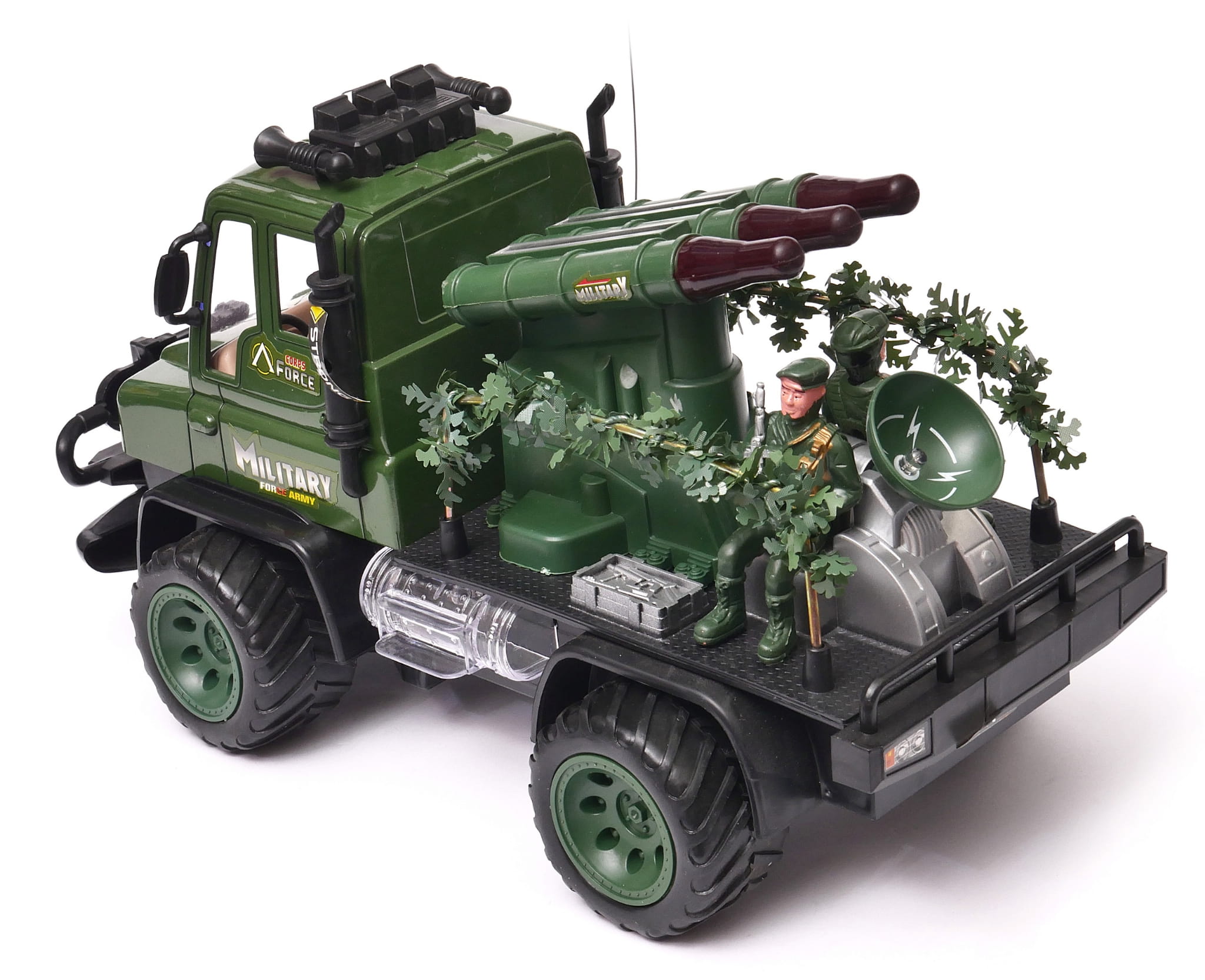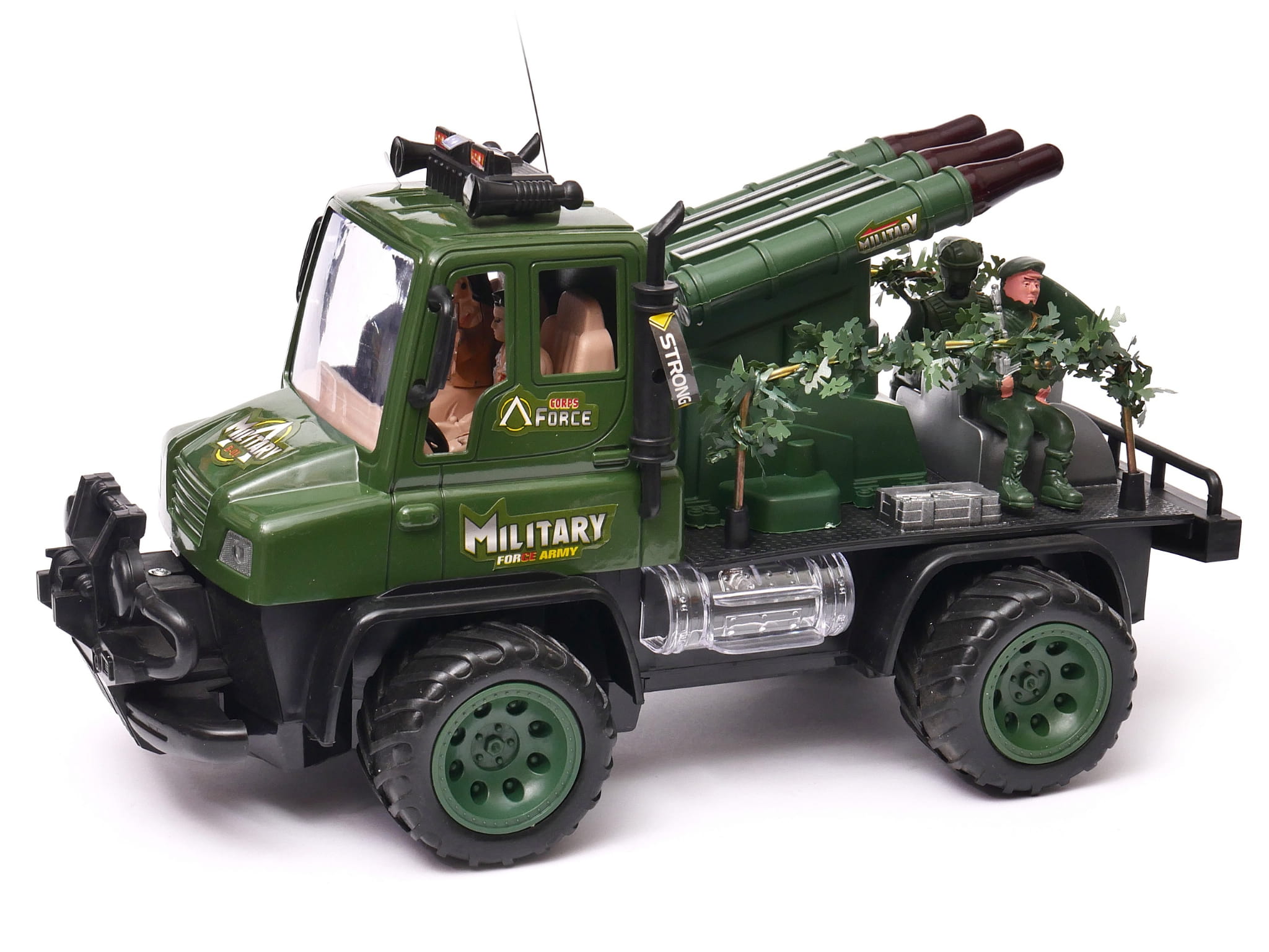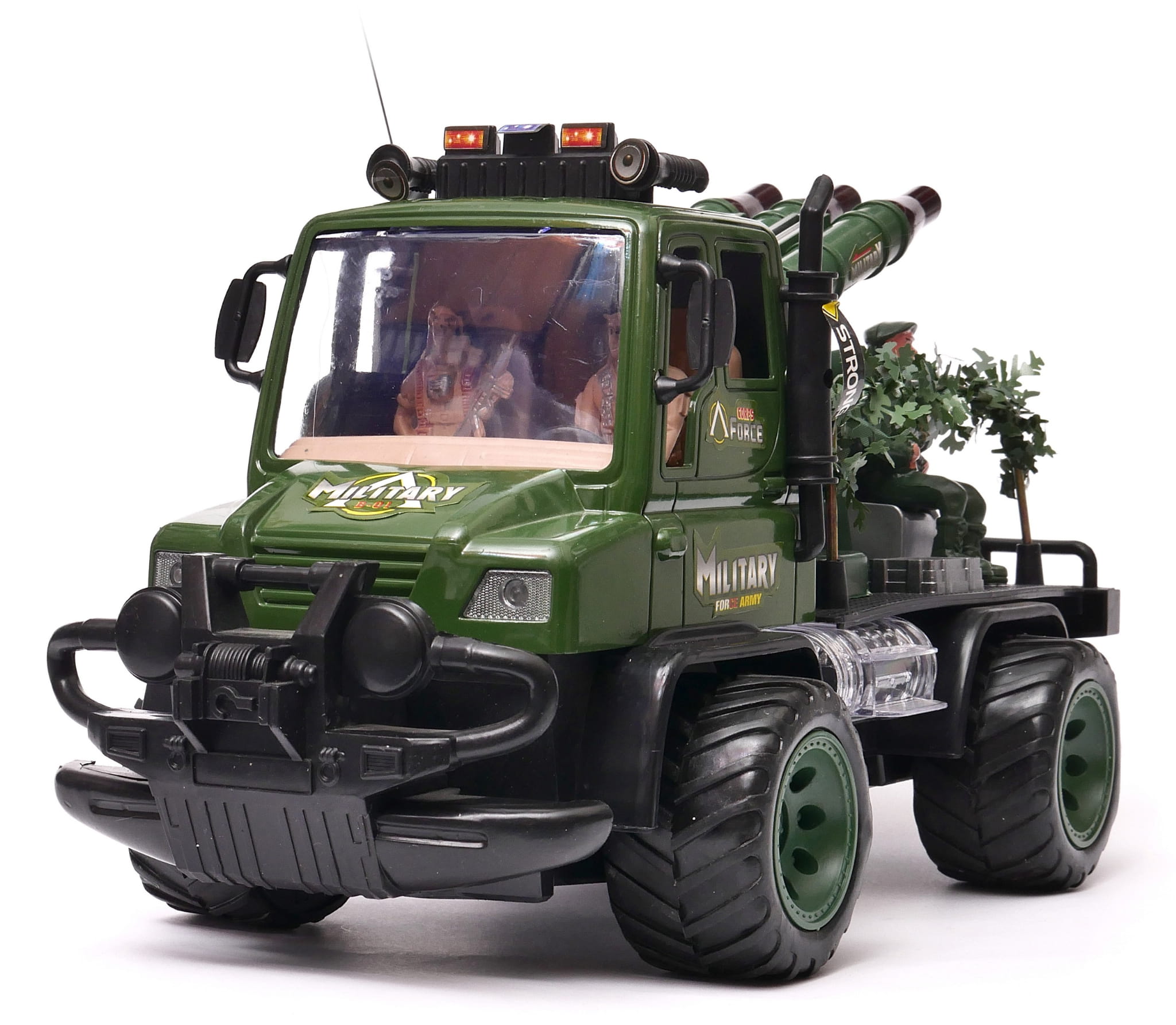 Wspaniały samochód zdalnie sterowany w postaci wojskowej ciężarówki. Ciężarówka wyposażona jest w duże terenowe koła i masywny zderzak. Z tyłu znajduje się wyrzutnia rakiet. Autko zasilane jest z pakietu akumulatorków,które ładuje się dołączaną ładowarką.