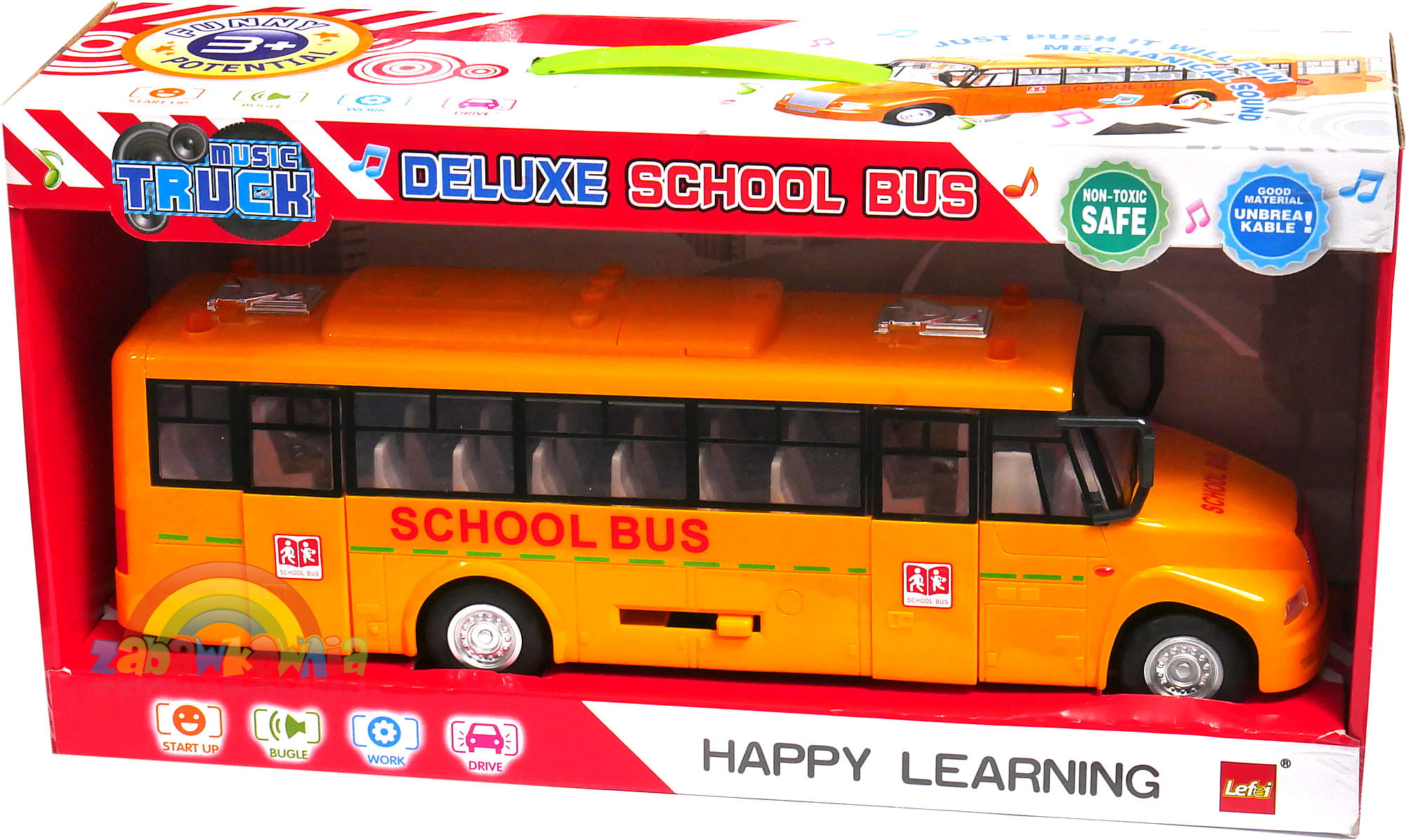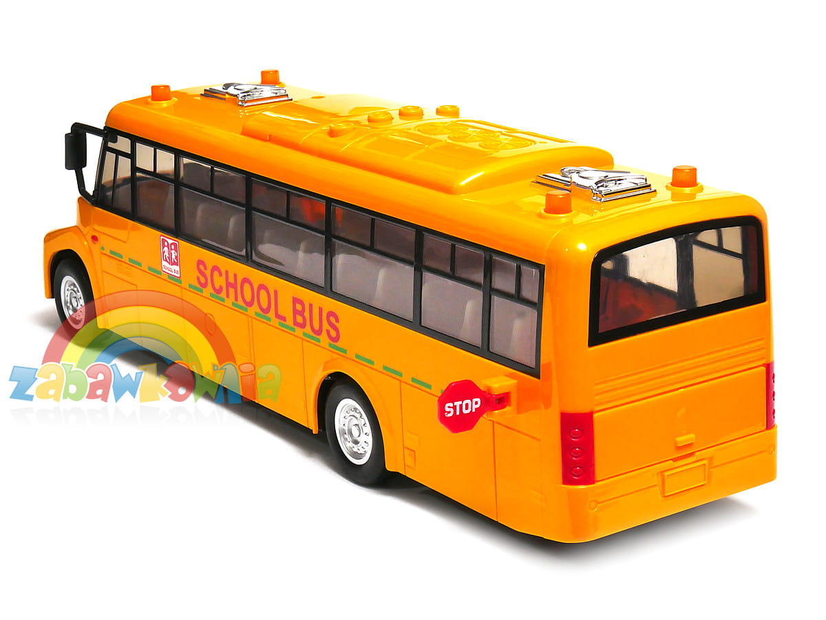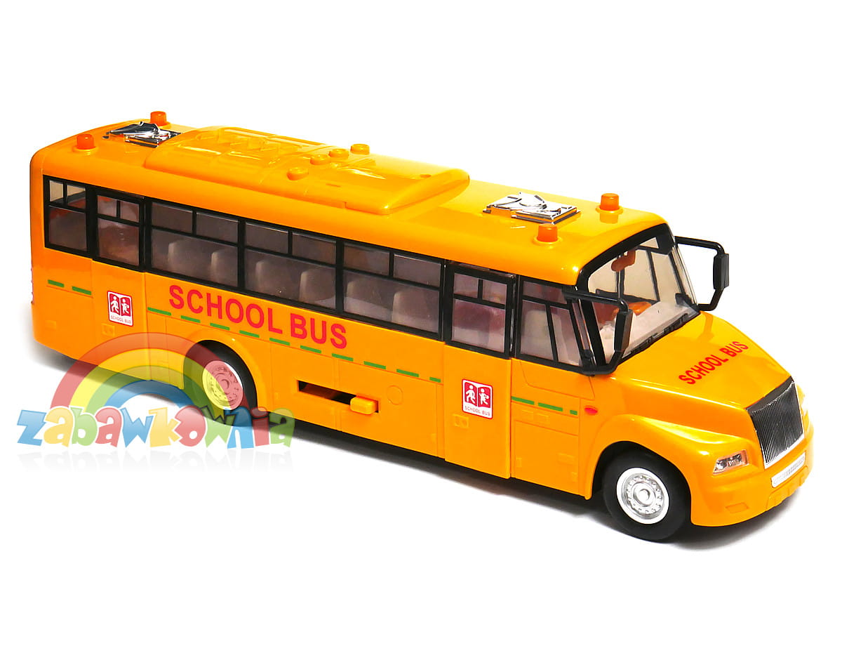 Duży autobus szkolny z otwieranymi drzwiami. Otwierają się one za pomocą dźwigni, która otwiera oboje drzwi równocześnie. Autobus wyposażony jest w napęd zamachowy i gumowe opony zwiększając przyczepność do podłoża, a tym samym komfort zabawy. Na dachu autobusu znajdują się przyciski włączające dźwięki i światła. Autobus wykonany został z bardzo wysokiej jakości tworzywa o grubych ściankach zapewniając bezpieczeństwo i trwałość zabawki. Autobus spodoba się małym miłośnikom motoryzacji.