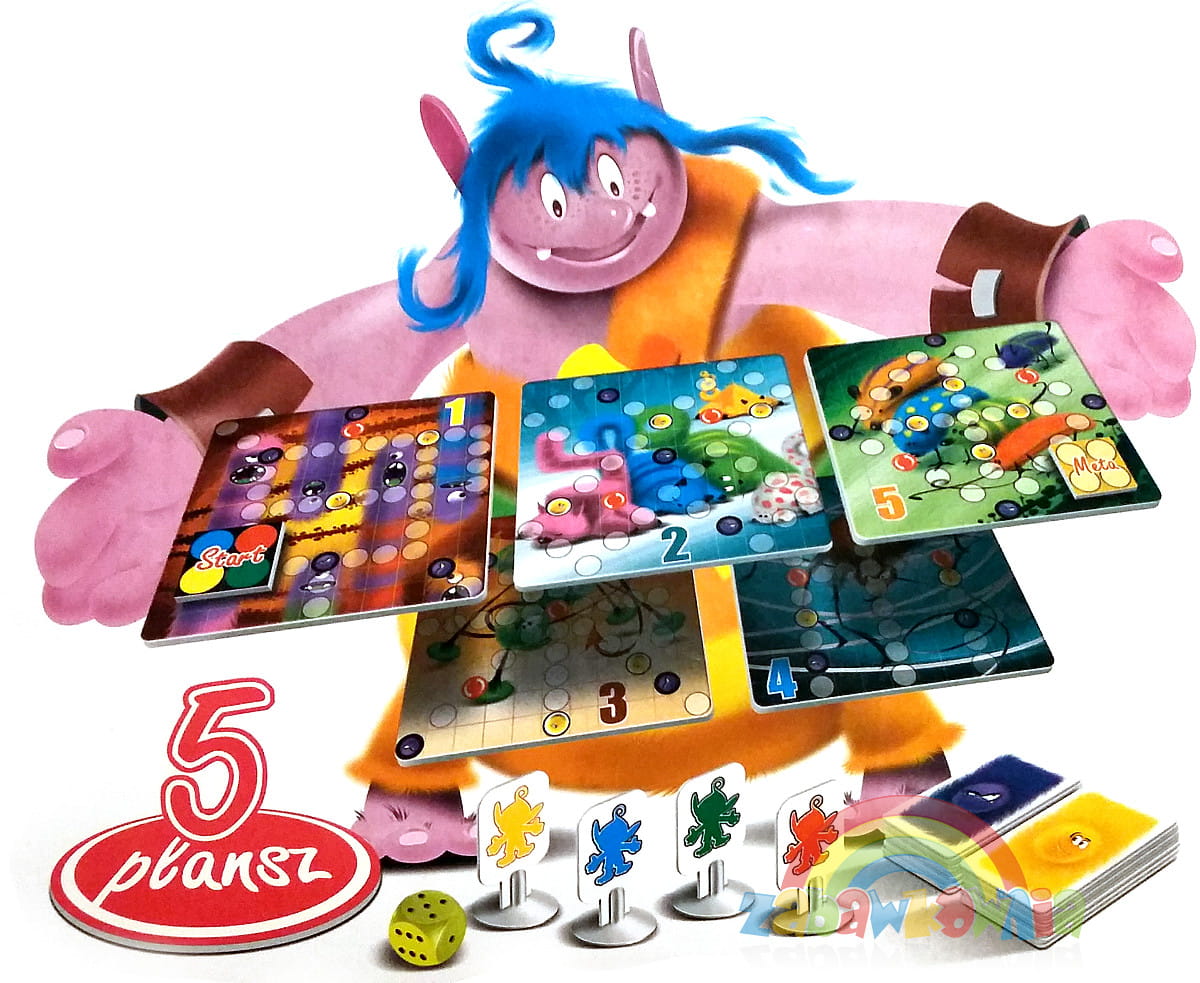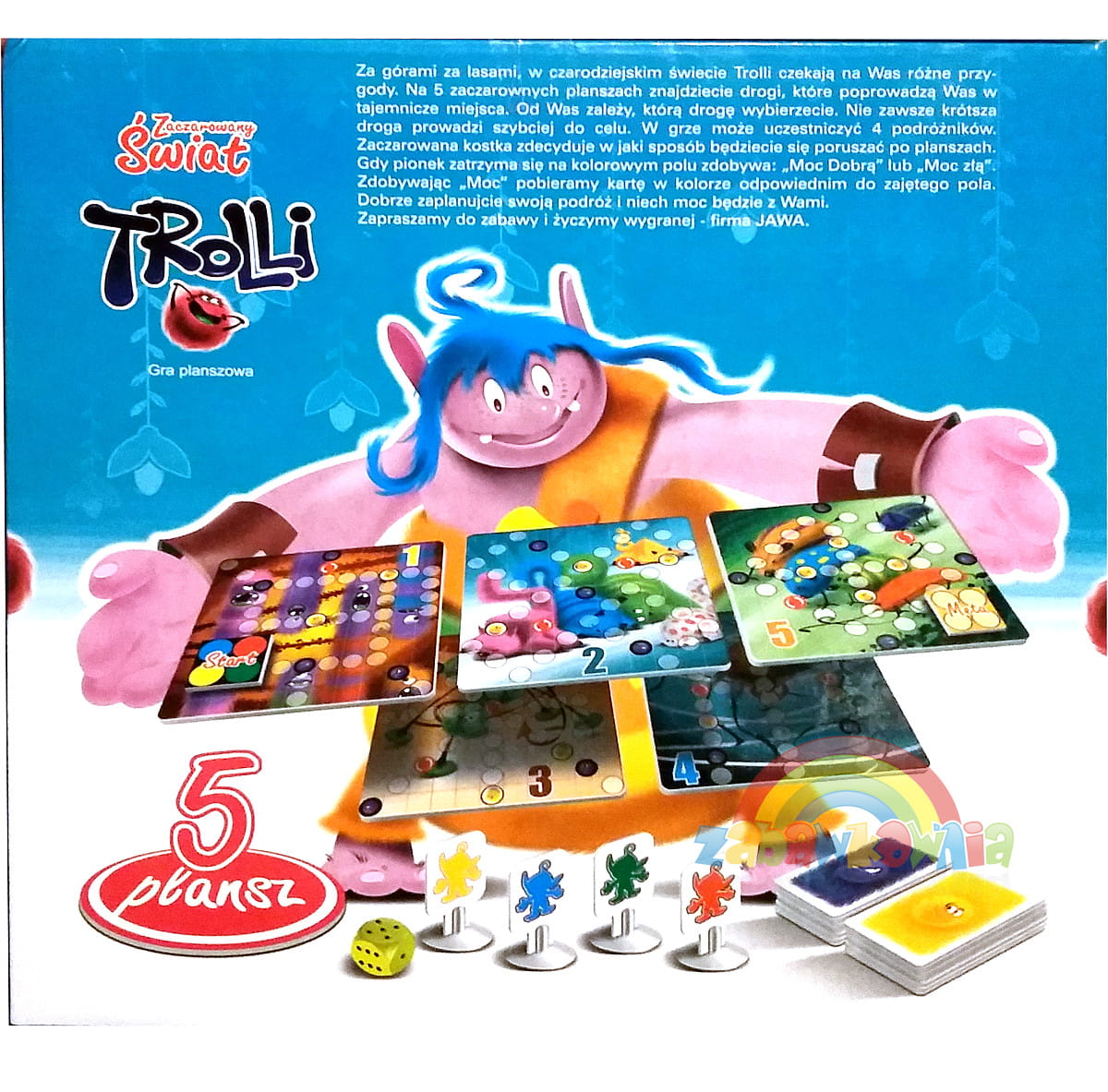 Za górami za lasami, w czarodziejskim świecie Trolli czekają na Was różne przy- gody. Na pięciu zaczarowanych planszach znajdziecie drogi, które poprowadzą Was w tajemnicze miejsca. Od Was zależy, którą drogę wybierzecie. Nie zawsze krótsza droga prowadzi szybciej do celu. W grze może uczestniczyć 4 podróżników. Zaczarowana kostka zdecyduje w jaki sposób będziecie się poruszać po planszach. Gdy pionek Troll zatrzyma się na kolorowym polu zdobywa: „Moc Dobrą" lub „Moc złą". Zdobywając „Moc" pobieramy kartę w kolorze odpowiednim do zajętego pola Dobrze zaplanujcie swoją podróż po Świecie Trolli i niech moc Trolli będzie z Wami.