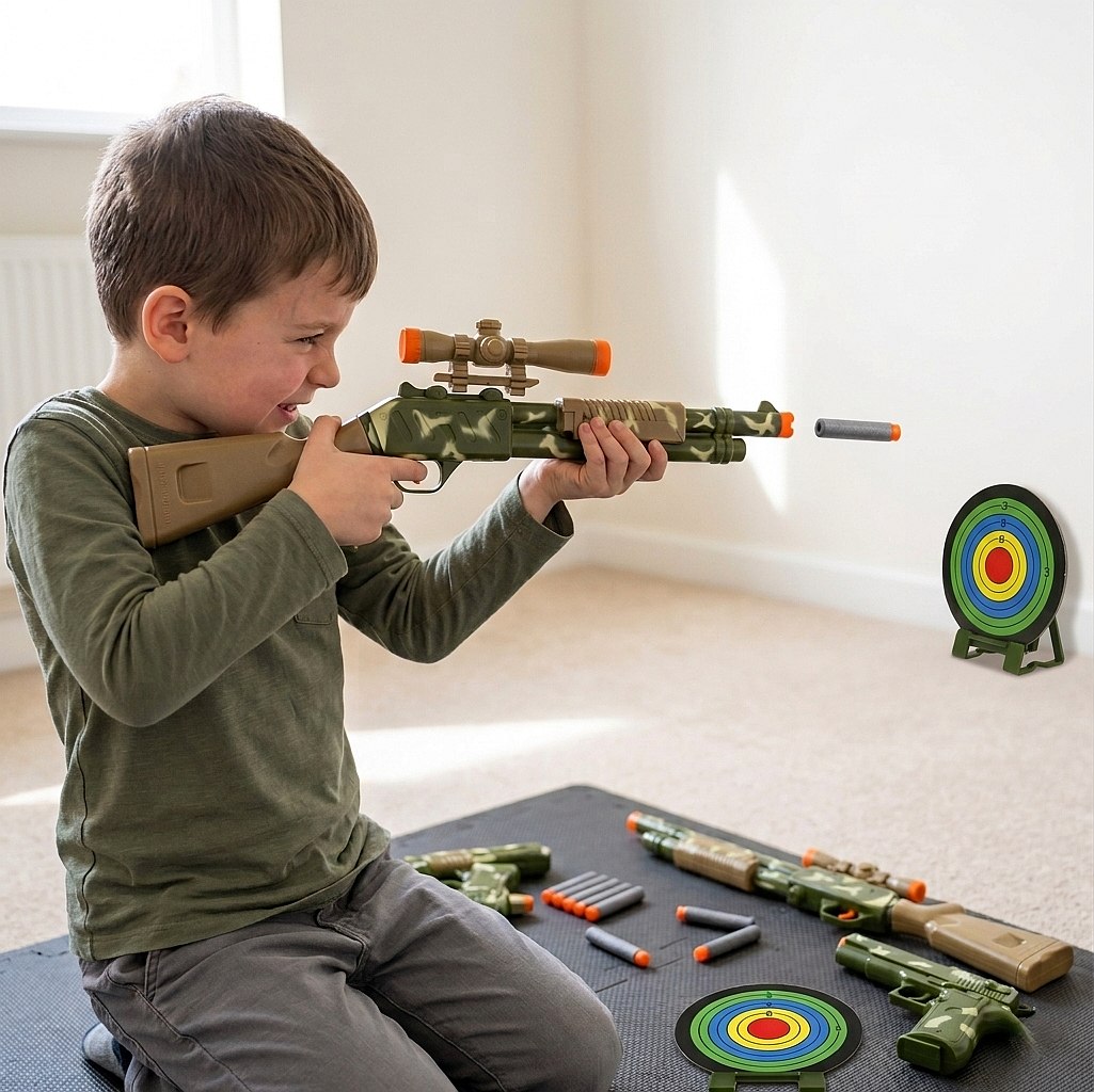 Poczuj emocje prosto z pola bitwy dzięki kompletnemu zestawowi strzeleckiemu inspirowanemu światem gier action-shooter! To idealna zabawka dla młodych adeptów strzelectwa, która pozwala na bezpieczny trening celności w domowym zaciszu lub ogrodzie.
